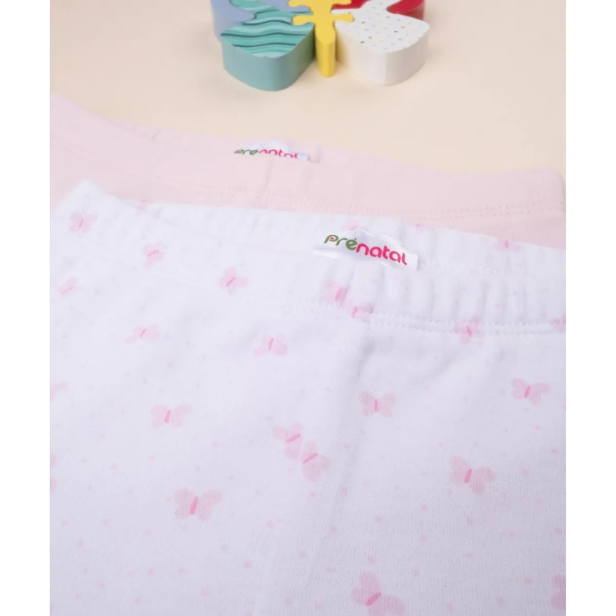 Este set incluye 2 pantalones de bebé con pies incorporados, diseñados en algodón 100% para aportar suavidad y comodidad a la piel más delicada. Uno de los modelos presenta un encantador color rosa pastel, mientras que el otro luce un fondo blanco con estampado all-over de mariposas en tonos coordinados, creando un conjunto variado y versátil para el uso diario.