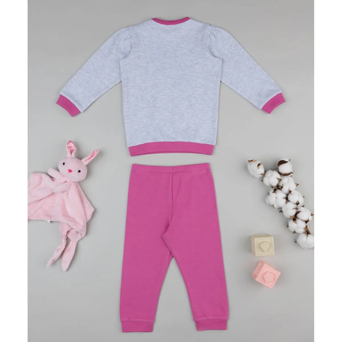 Suave pijama de dos piezas para niña. La prenda presenta una base gris claro con estampado de conejo estilizado en tono rosa perfectamente coordinado con los puños y el cuello redondo; el ajuste es holgado y práctico gracias a botones automáticos en el hombro del mismo tono; el pantalón es totalmente rosa intenso con elástico en la cintura que permite un ajuste regulable. Accesorios no a la venta. El paquete contiene solo la prenda de vestir.