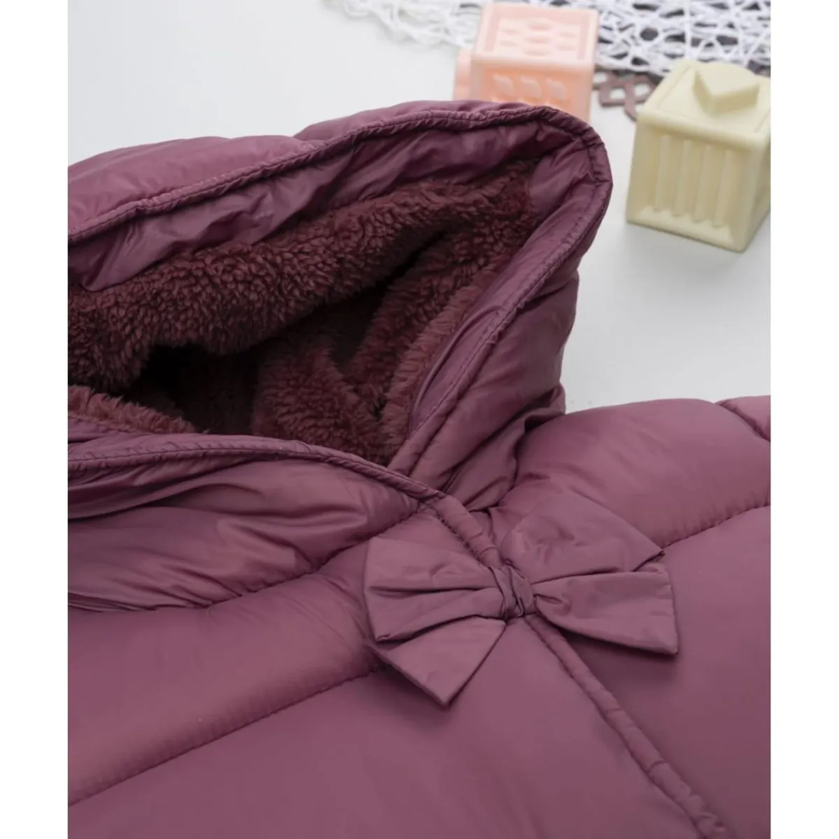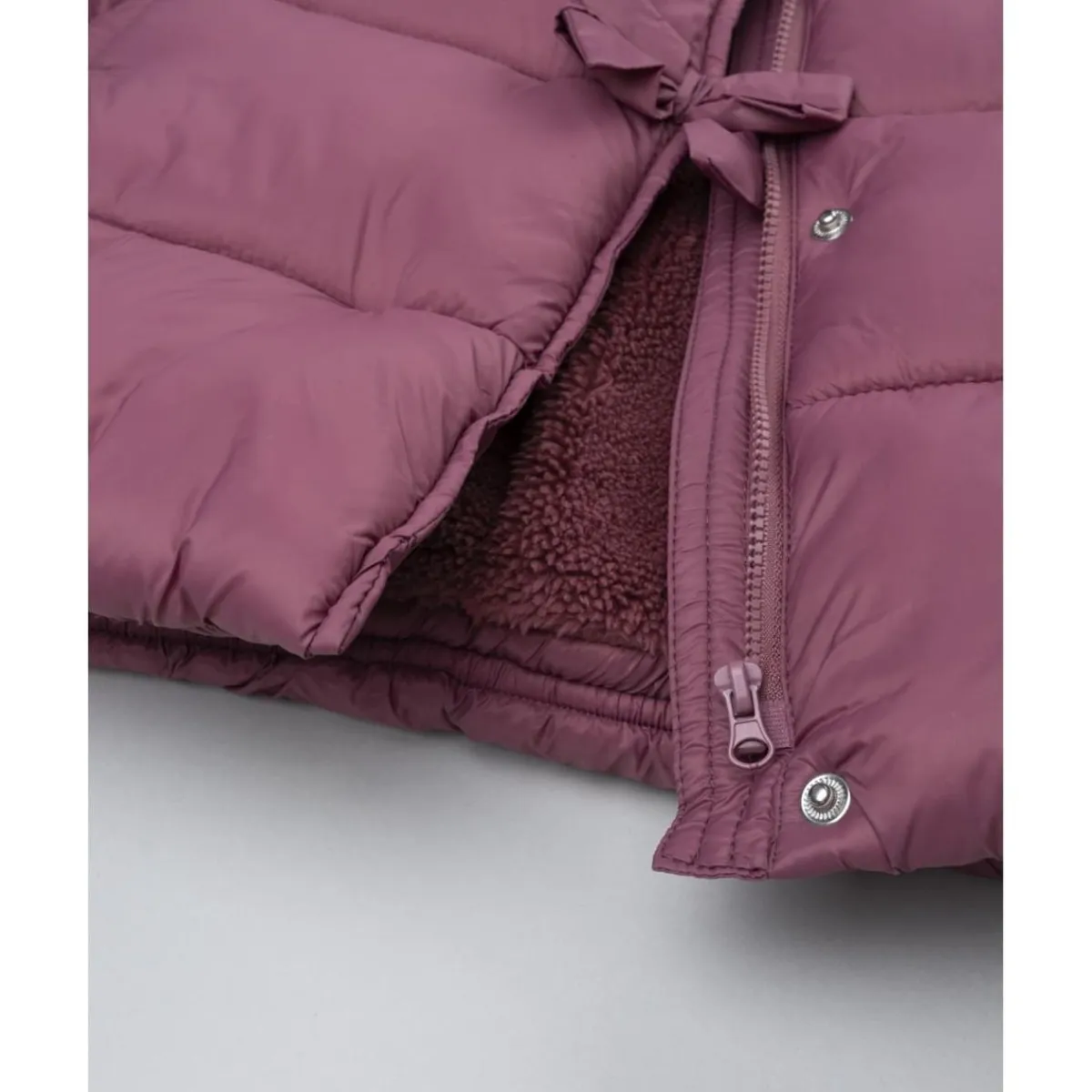 Este plumífero con capucha en rosa antiguo combina dulzura y protección para el invierno. Su interior en pelo sintético suave aporta calidez extra, mientras que los lazos decorativos añaden un toque femenino.