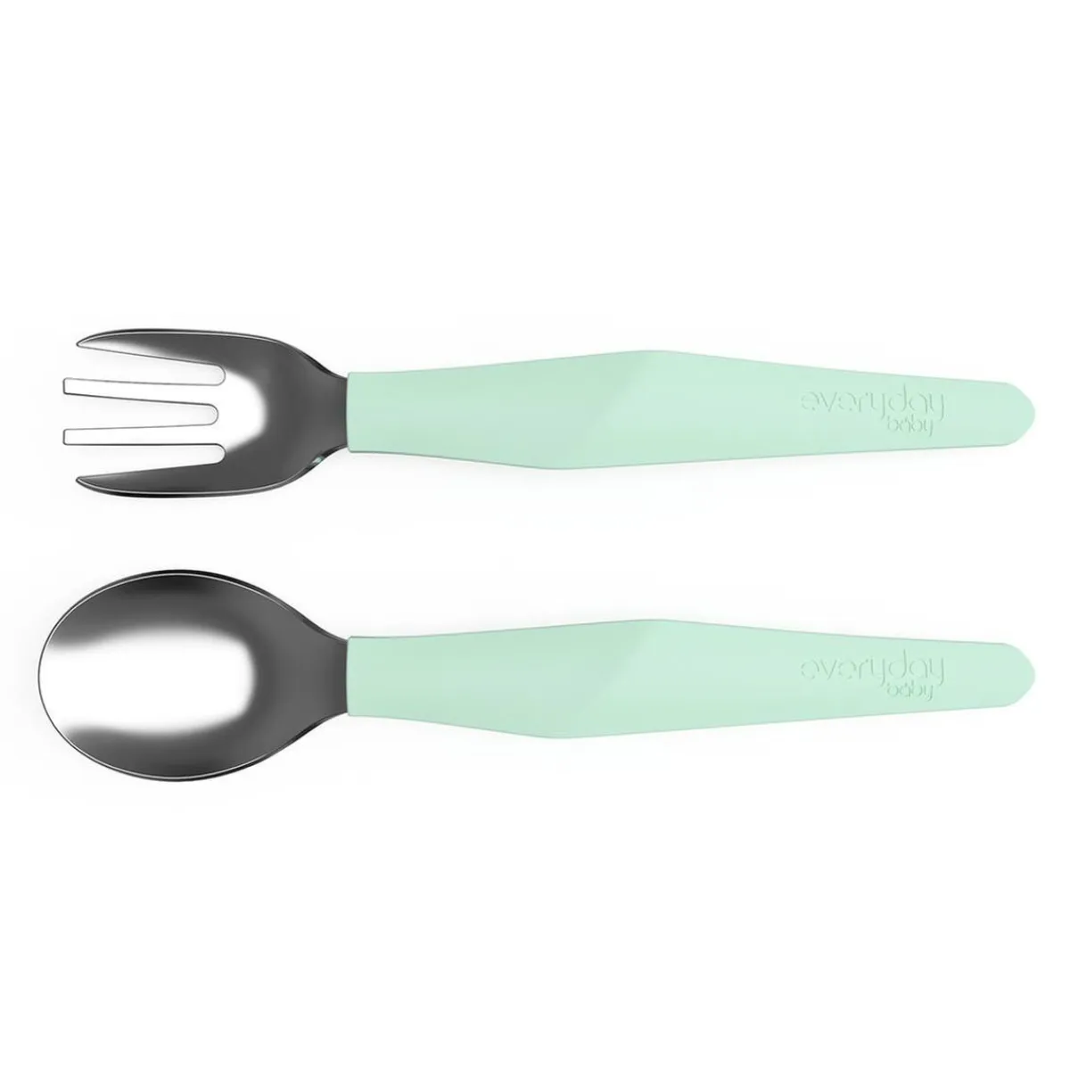 Set de cubiertos para bebé menta, un set de cuchara y tenedor de color verde menta.