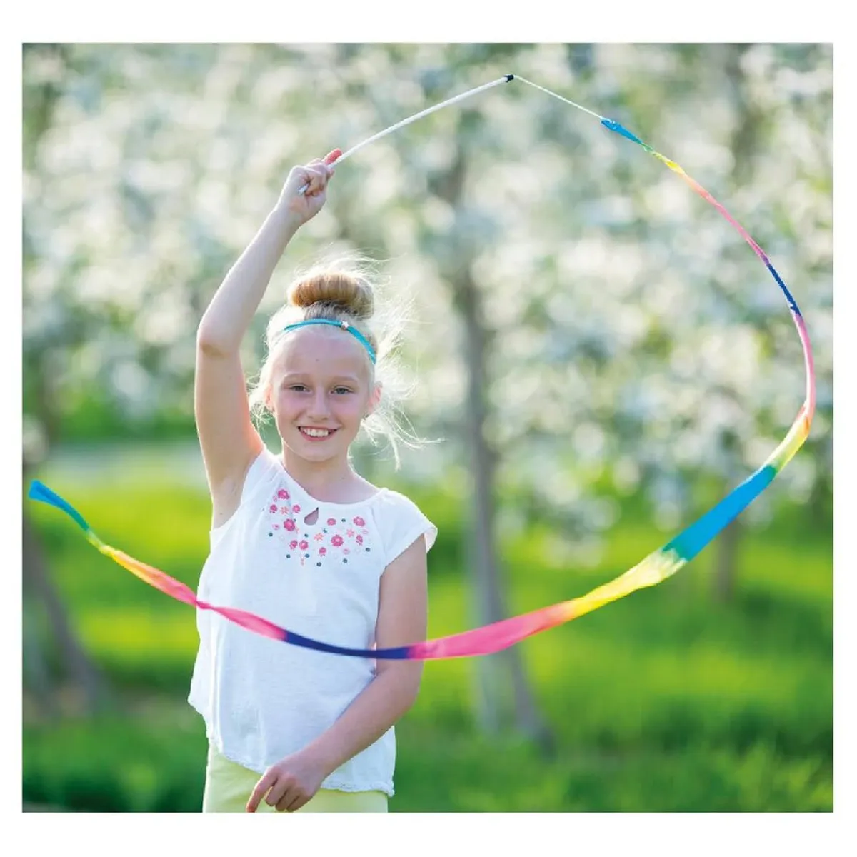 Con esta cinta podrán jugar y hacer figuras, es de tela multicolor y lleva un puño de plástico para agarrarla.