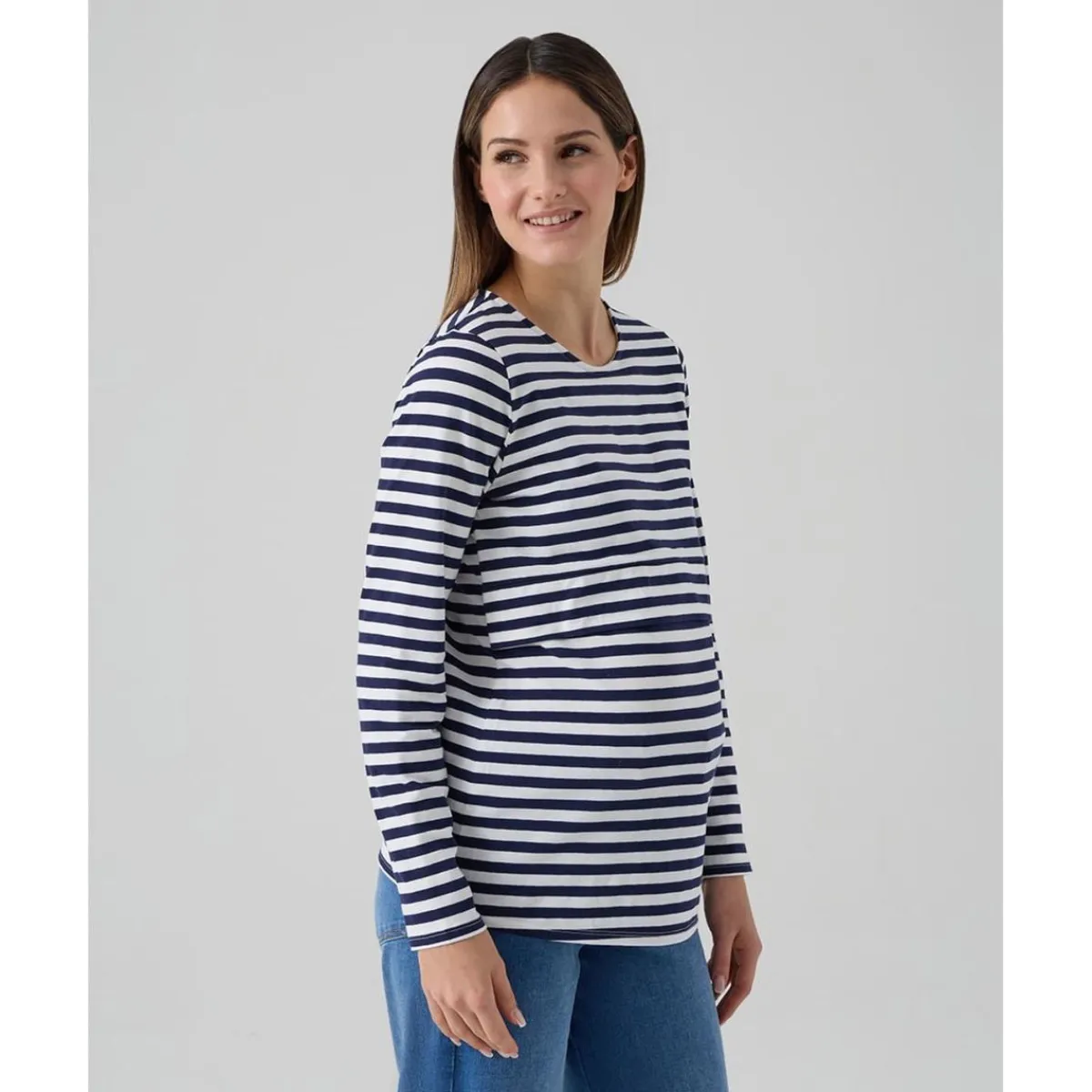 Esta t-shirt de lactancia es ideal para las mamás que desean comodidad y estilo mientras amamantan. Con un diseño de rayas blancas y azules, la camiseta tiene un doblez superior práctico para levantar y aberturas laterales que facilitan la lactancia en total comodidad. Su ajuste cómodo la hace adecuada tanto para el embarazo como para el postparto.