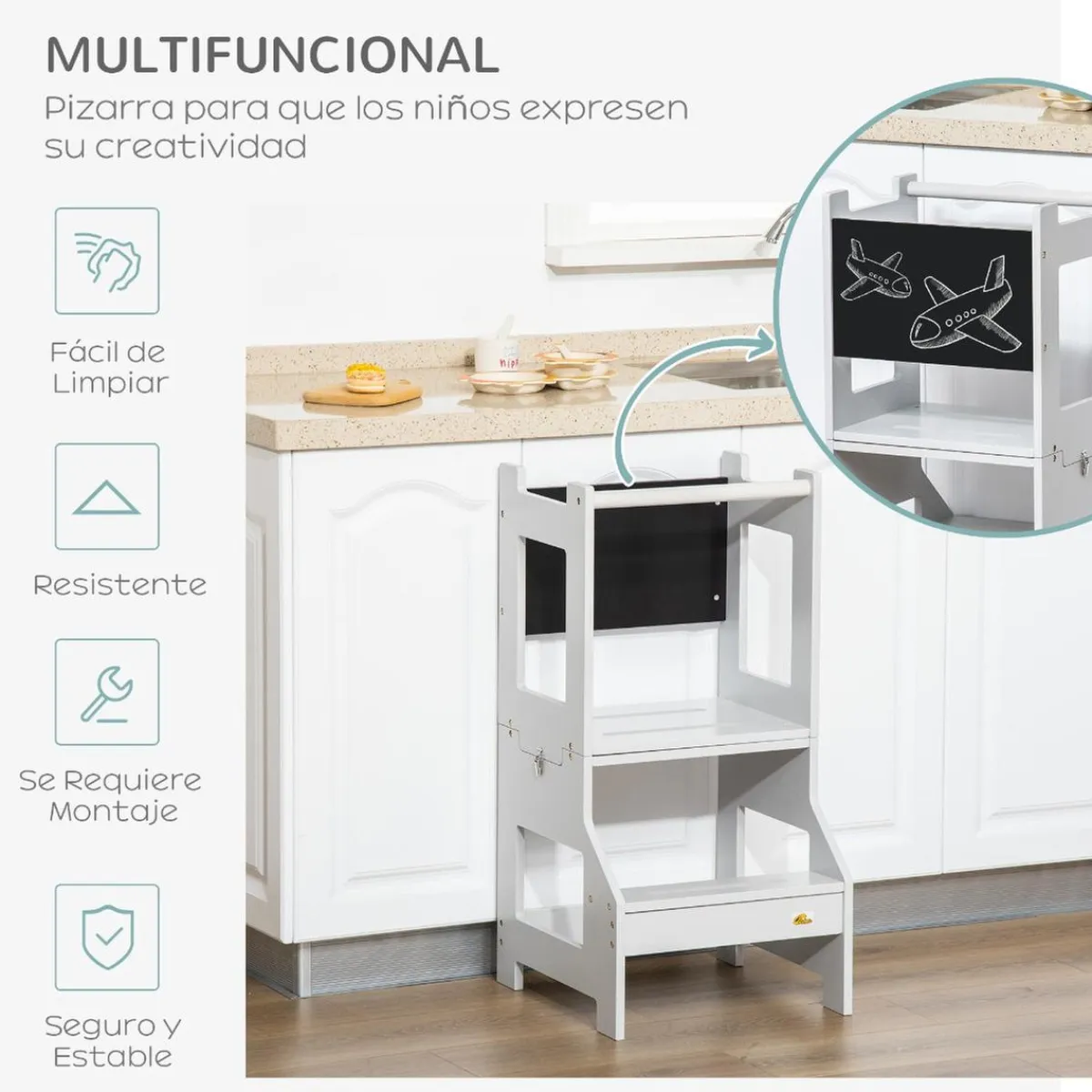Fomenta la independencia de los peques con esta torre de aprendizaje. Fabricada en MDF con estructura trapezoidal, es segura y estable. Su diseño 2 en 1 permite convertirla rápidamente en una mesa y silla infantil, ideal para pintar o leer cuentos.