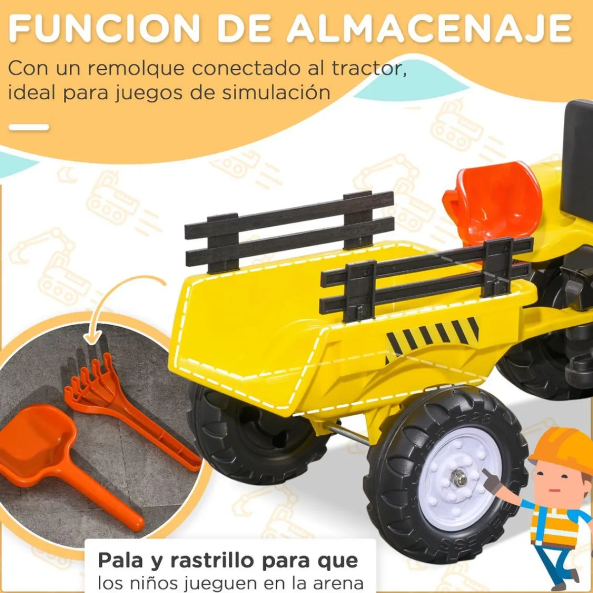El remolque se puede desmontar y viene con 2 accesorios para jugar en la arena. El volante gira tanto a la izquierda como a la derecha y puede ir hacia adelante y atrás pedaleando, de modo que tu hijo hará ejercicio mientras juega.
