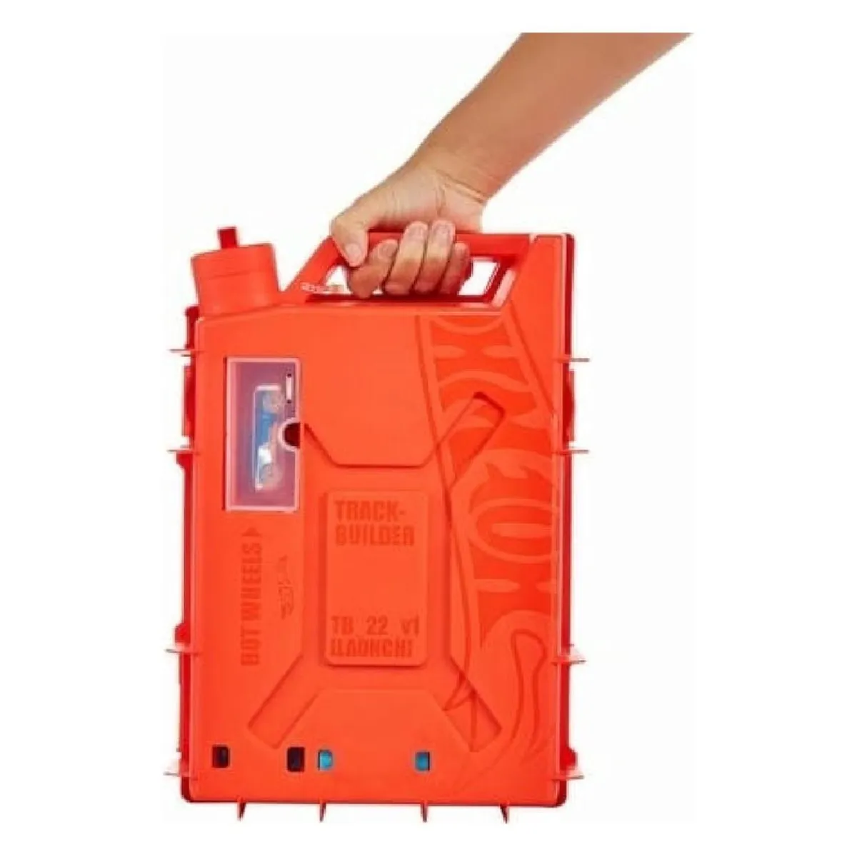 La caja del embalaje no solo sirve de almacenamiento útil y muy chula, sino que también se transforma en parte de la pista de juego. Se abre en ángulo recto para que el coche acelere en vertical antes del loop final.