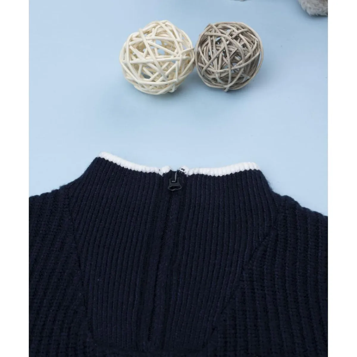 Suave jersey tricot para bebé en color azul noche, con adorable detalle de perrito bordado y pequeños acentos en blanco. Su tejido cálido y el cierre con media cremallera en la parte frontal lo hacen muy práctico para vestir al bebé con facilidad y confort.