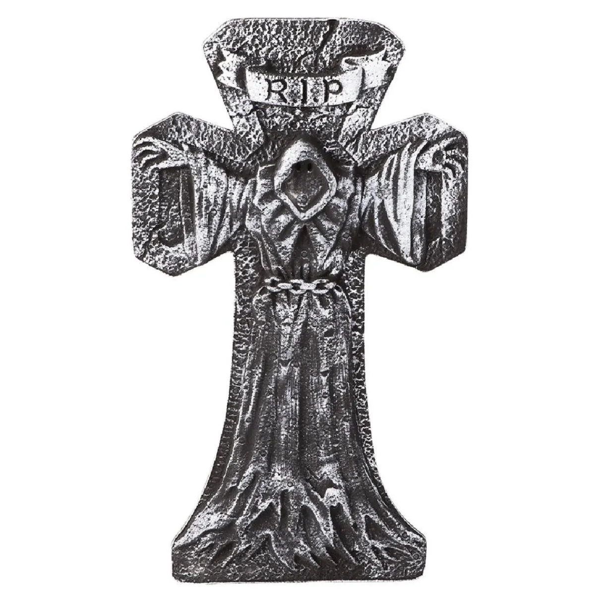 Lápida Cruz RIP, una lápida de PVC que puede ser usada como un accesorio de disfraz o de decoración.