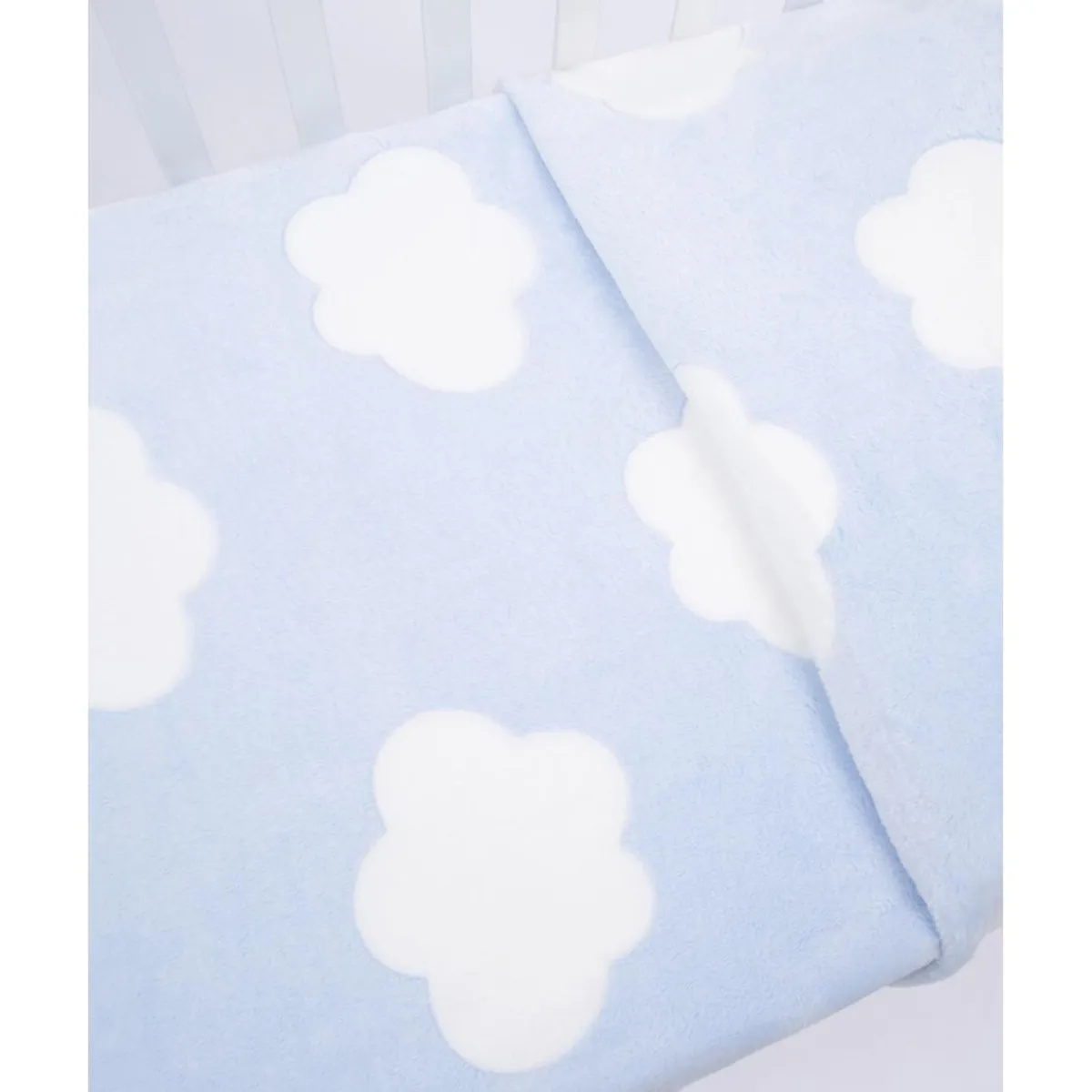 Mantén a tu bebé abrigado con esta manta de forro polar en color azul, decorada con grandes nubes blancas. Su tacto suave la convierte en una compañera ideal para las siestas y momentos de descanso.