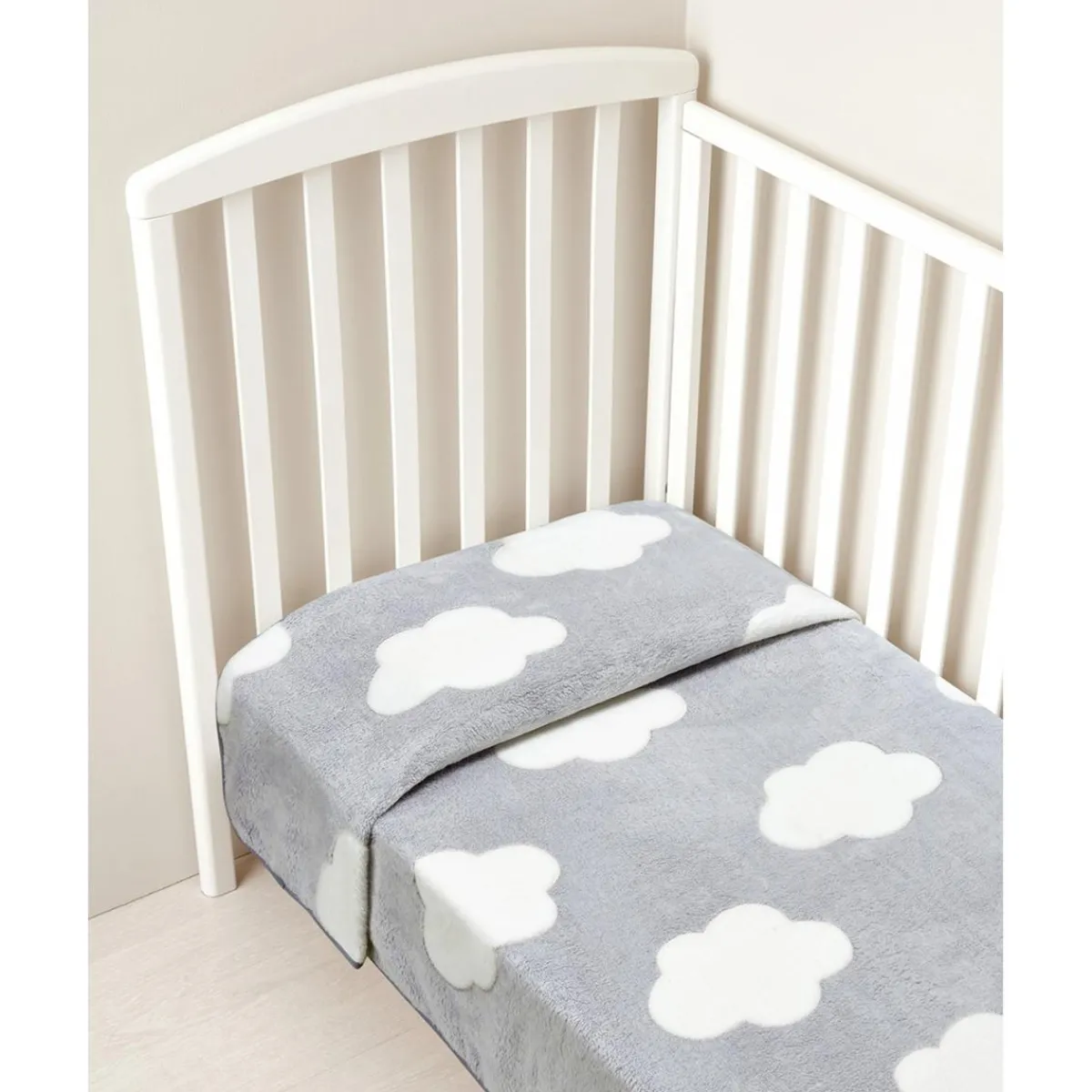 Esta manta para cama de peluche sintético en gris claro con diseño de nubes blancas es perfecta para proporcionar calidez y estilo al espacio de descanso de tu pequeño.