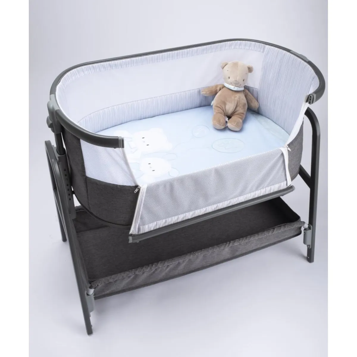 Esta acogedora manta de cuna para niño está confeccionada en felpa, ideal para cunas y cochecitos. Presenta un fondo azul con lunares y un bordado de «osito y cochecito» en tonos blancos y azul claro. Es práctica, cálida y envolvente, con dimensiones de 70×80 cm.