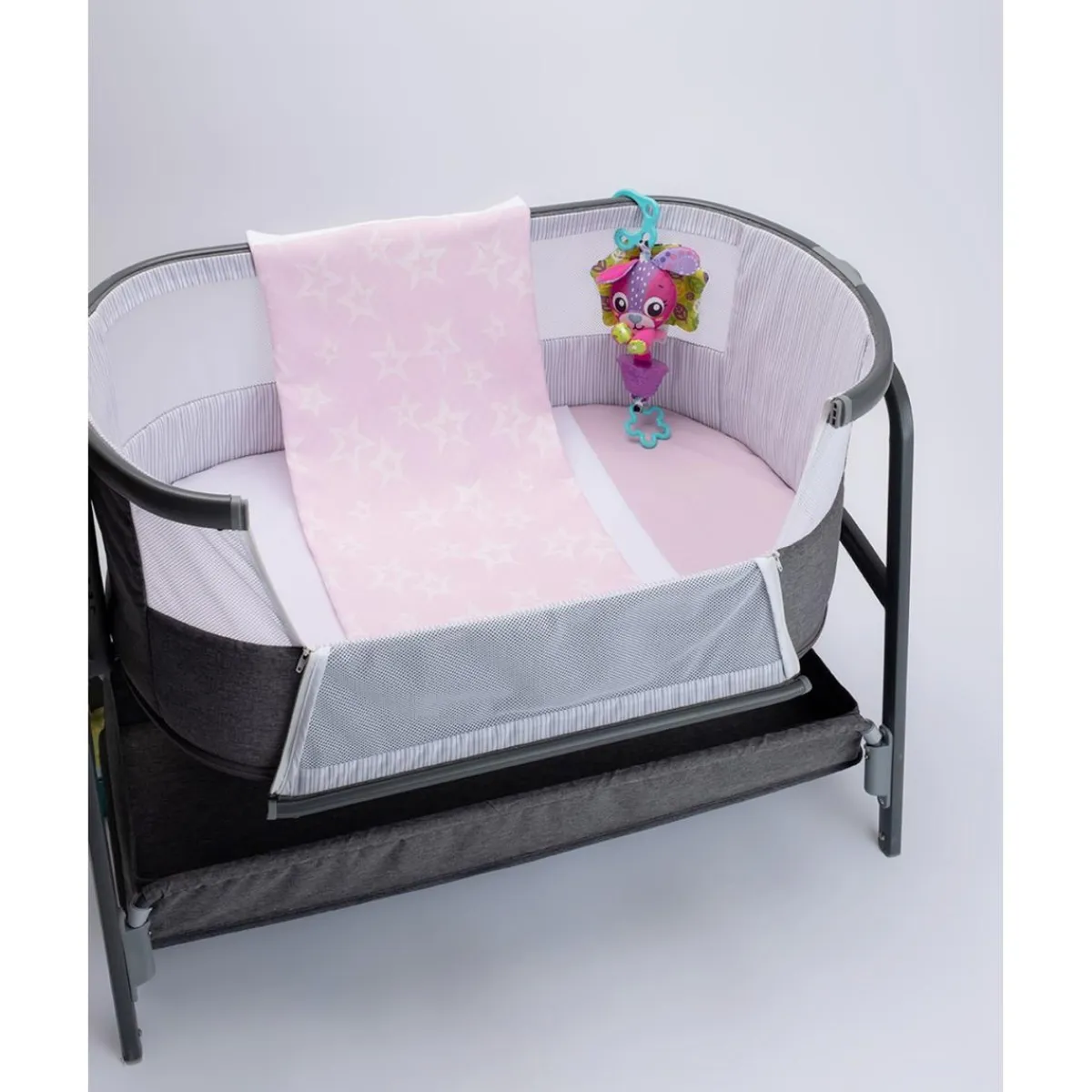 Preciosa manta de cuna en tono rosa pastel con un diseño reversible: un lado liso y el otro con un delicado estampado de estrellas blancas. Fabricada en suave jersey de algodón 100%, es perfecta para mantener al bebé cómodo en cualquier estación.