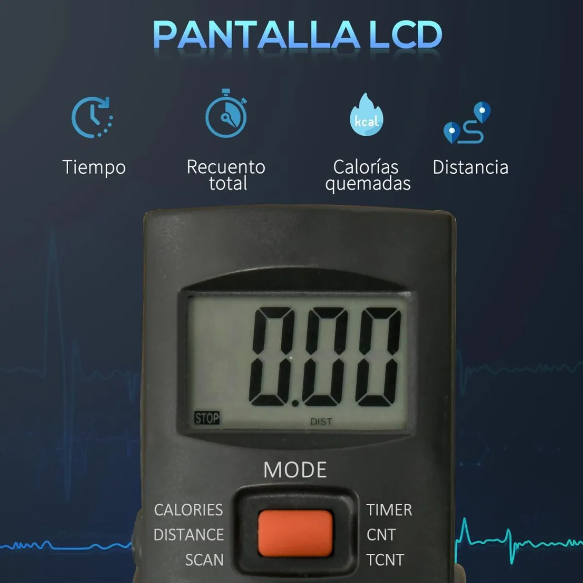 - Pequeña pantalla LCD donde se registran diferentes parámetros del ejercicio (tiempo, distancia y calorías).