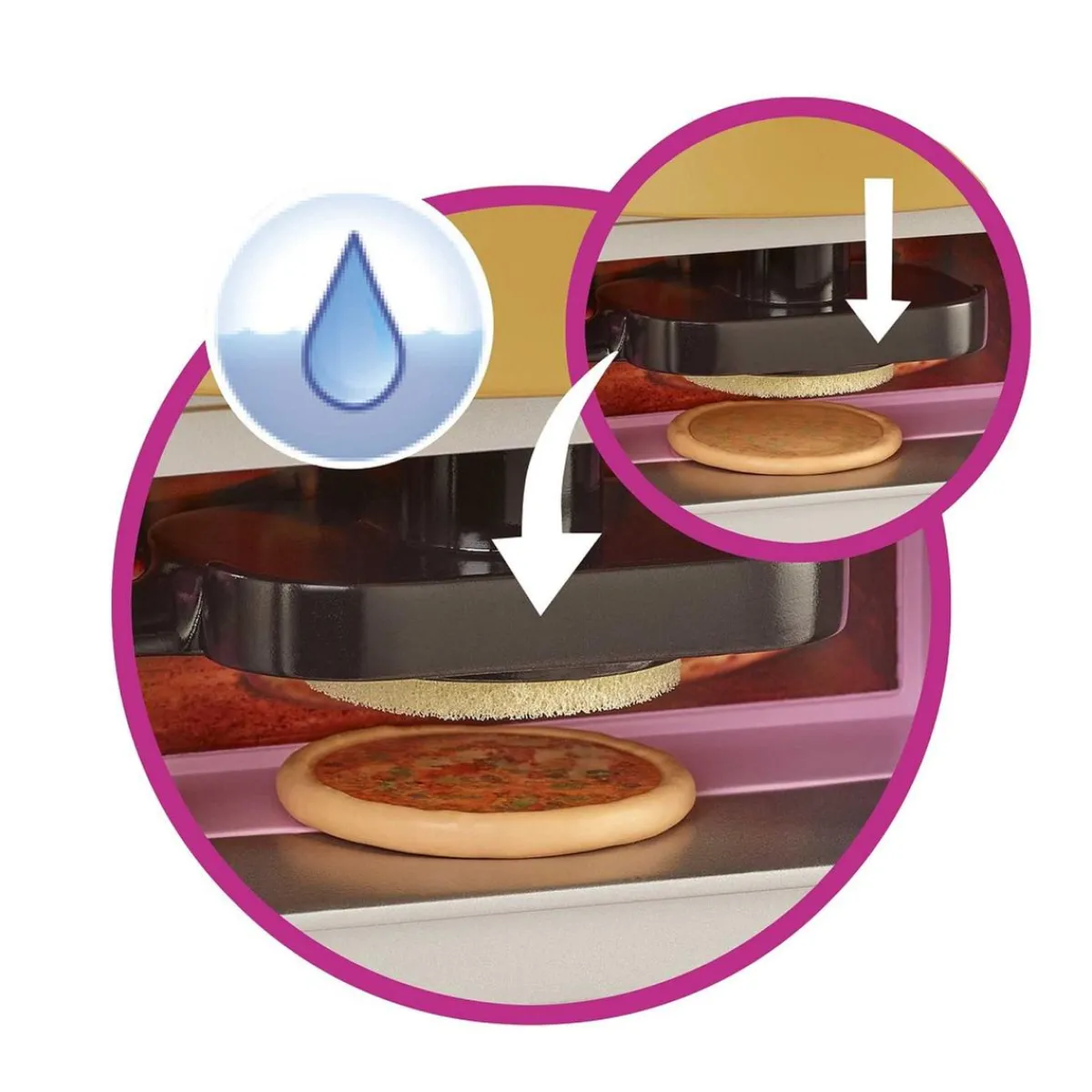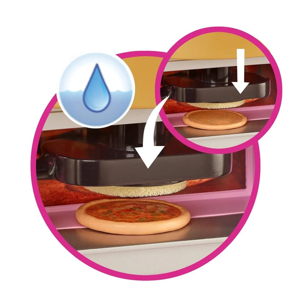 En la cocina, tendrán que encargarse de preparar las hamburguesas en la parrilla giratoria, organizar los dulces en la vitrina giratoria de postres y meter una pizza en el horno y vigilar cómo cambia de color cuando está lista.