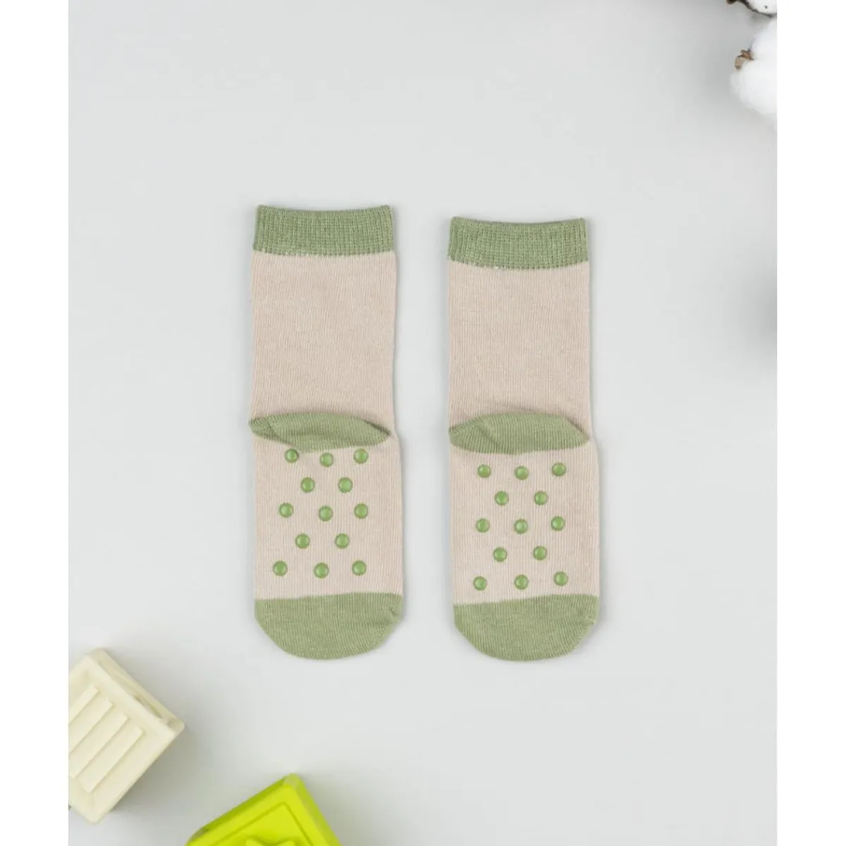 Divertidos calcetines antideslizantes en color beige con dibujo de león y detalles en verde. Los pequeños puntos de goma en la suela aportan seguridad y evitan resbalones.