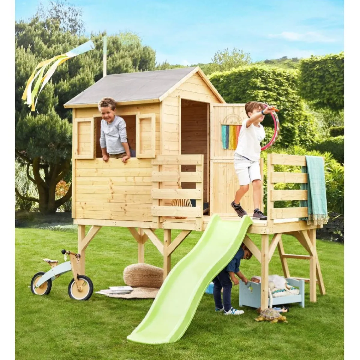 ¡Esta casa de madera con tobogán será un verdadero triunfo para tu pequeño! A los niños les encantará subirse a la terraza y deslizarse por el tobogán de 178 cm de largo. Encontrarán un refugio seguro y agradable dentro de la cabaña desde donde podrán observar tranquilamente el entorno y jugar con sus amigos. ¡La manga de viento incluida marcará bien su territorio mientras aporta una nota de alegría a su exterior!