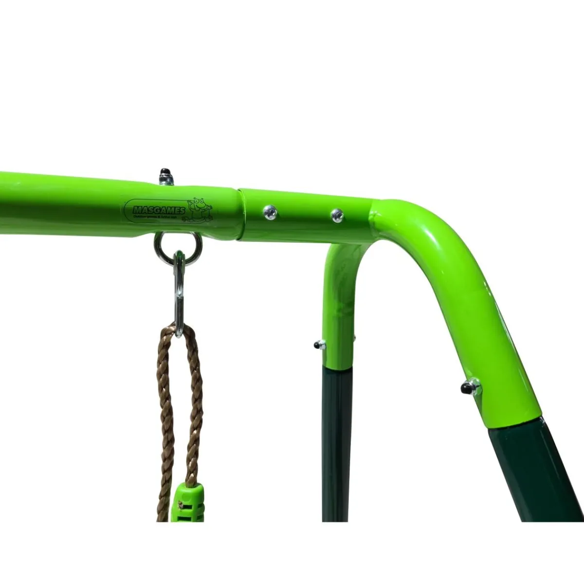 Las medidas del columpio doble MASGAMES OLEA son: 213 cm (largo) x 146 cm (ancho) x 180 cm (alto). El larguero de arriba tiene una longitud de 165 cm. El área de seguridad del columpio es de 560 cm (largo) x 213 cm (ancho).