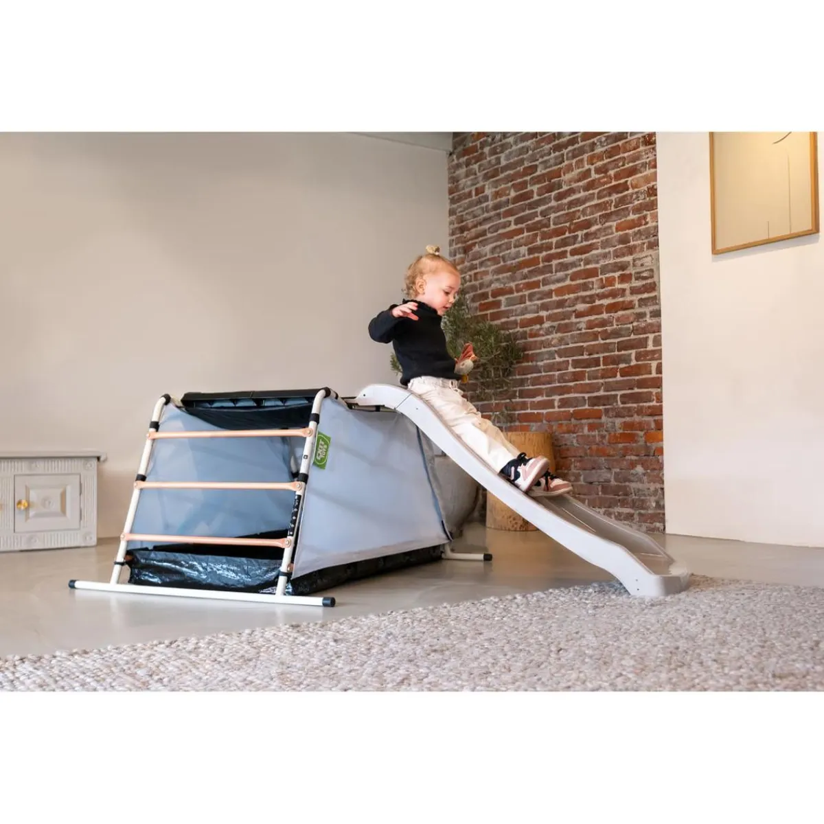 Debido a su tamaño compacto, este multiplay se puede utilizar tanto en exteriores como en interiores. El diseño contemporáneo con tonos de colores suaves hace que este multiplay luzca elegante dentro de tu hogar o en el jardín. Gracias al marco de acero, este multiplay es extra estable. La tienda de juegos tiene una capa de espuma en el techo, que ofrece protección contra golpes. Los niños a partir de 2 años pueden subir los peldaños y deslizarse con seguridad. La unidad de juego se puede montar fácilmente y, debido a su peso ligero, se puede mover o guardar con facilidad. La seguridad de este área de multijuego ha sido aprobada por el reconocido y reconocido instituto de pruebas TÜV.