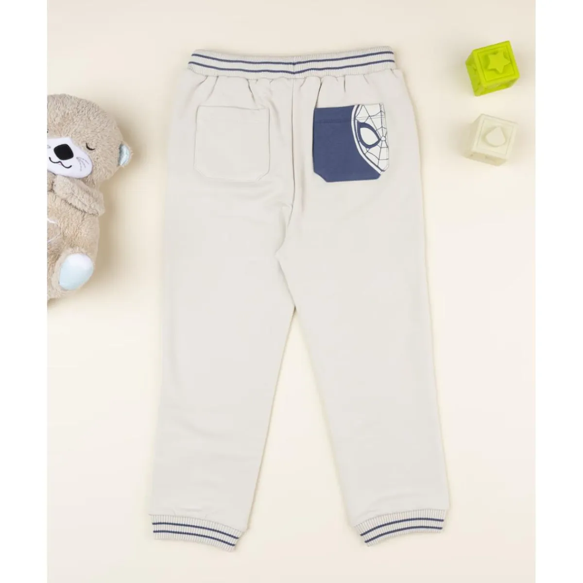 Casual y cómodo pantalón afelpado para niño en color beige con detalles en azul. Incluye bolsillos laterales y cintura elástica con cordón ajustable. Ideal para un look urbano con un toque divertido de Spiderman.