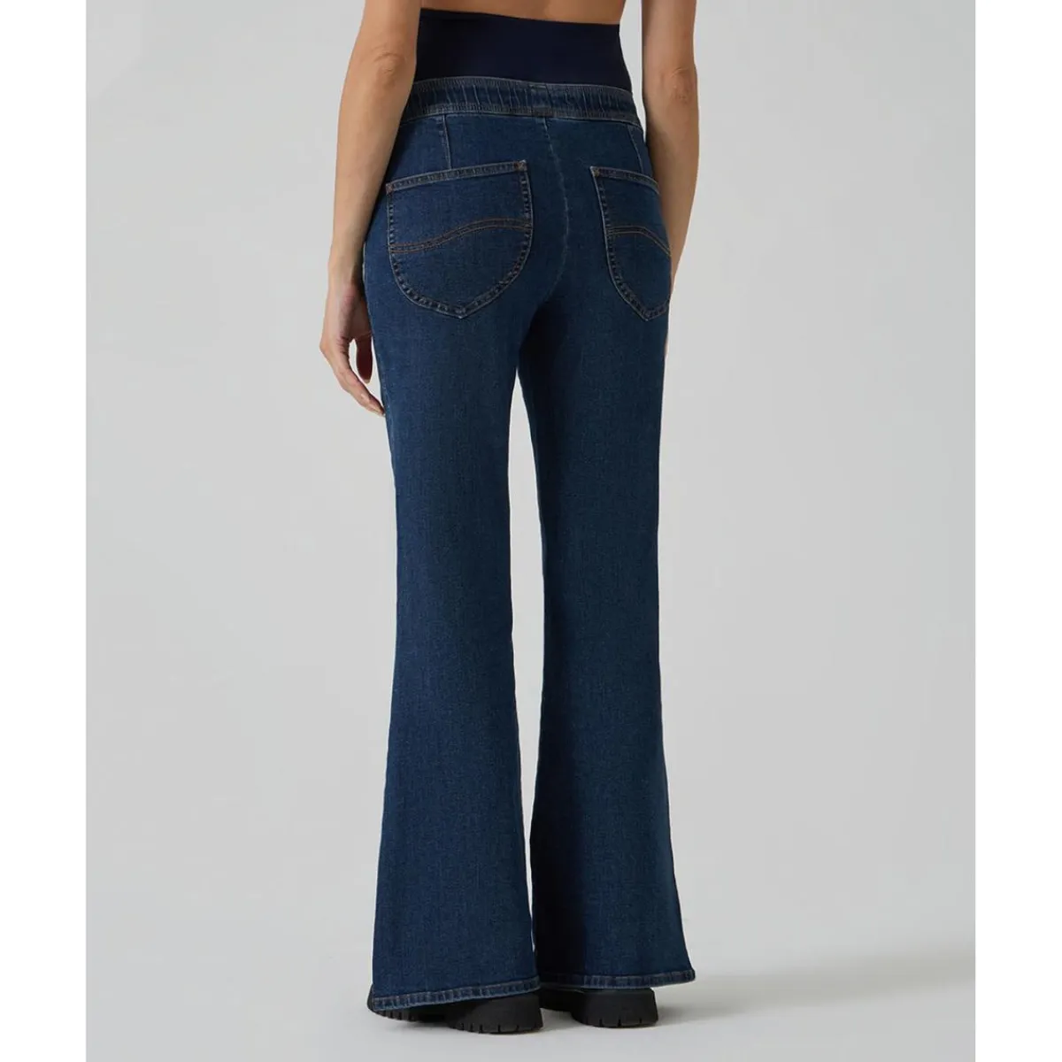 El pantalón premamá denim campana combina estilo moderno y comodidad total para el embarazo y el postparto. De tejido elástico con cintura alta de punto y banda ajustable, se adapta suavemente al crecimiento del abdomen sin oprimir. Su diseño con bolsillos y bajo acampanado estiliza la figura y permite usarlo incluso después del parto.