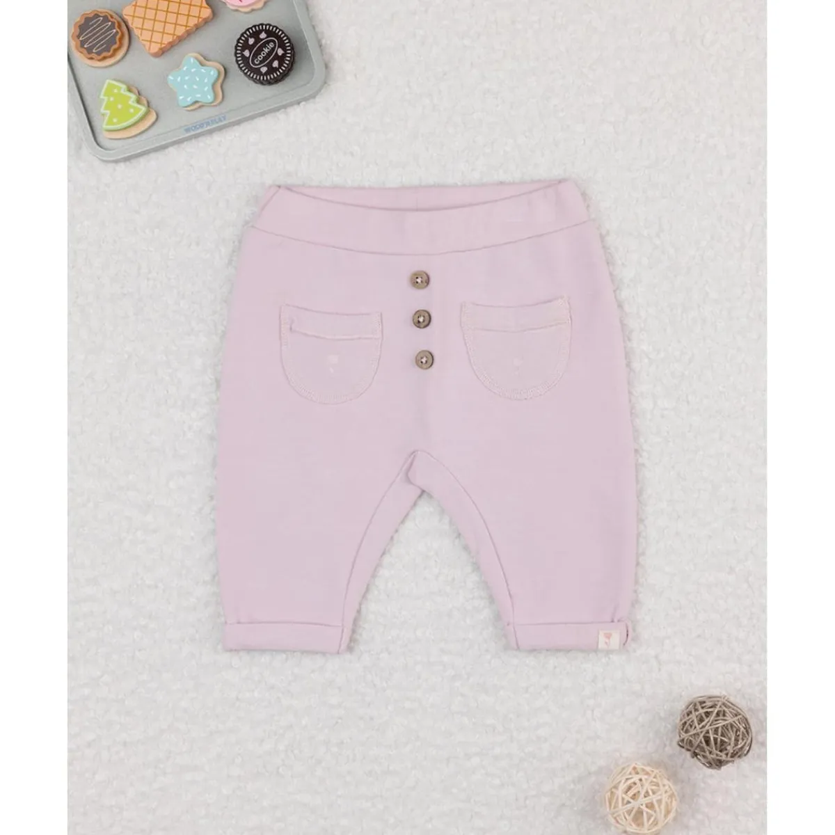 Pantalones French terry suaves para niña en rosa claro con bolsillos y botones falsos marrones. Ajuste cómodo y regulable con cintura elástica. Perfectos para looks casuales. Algodón Oeko-Tex.