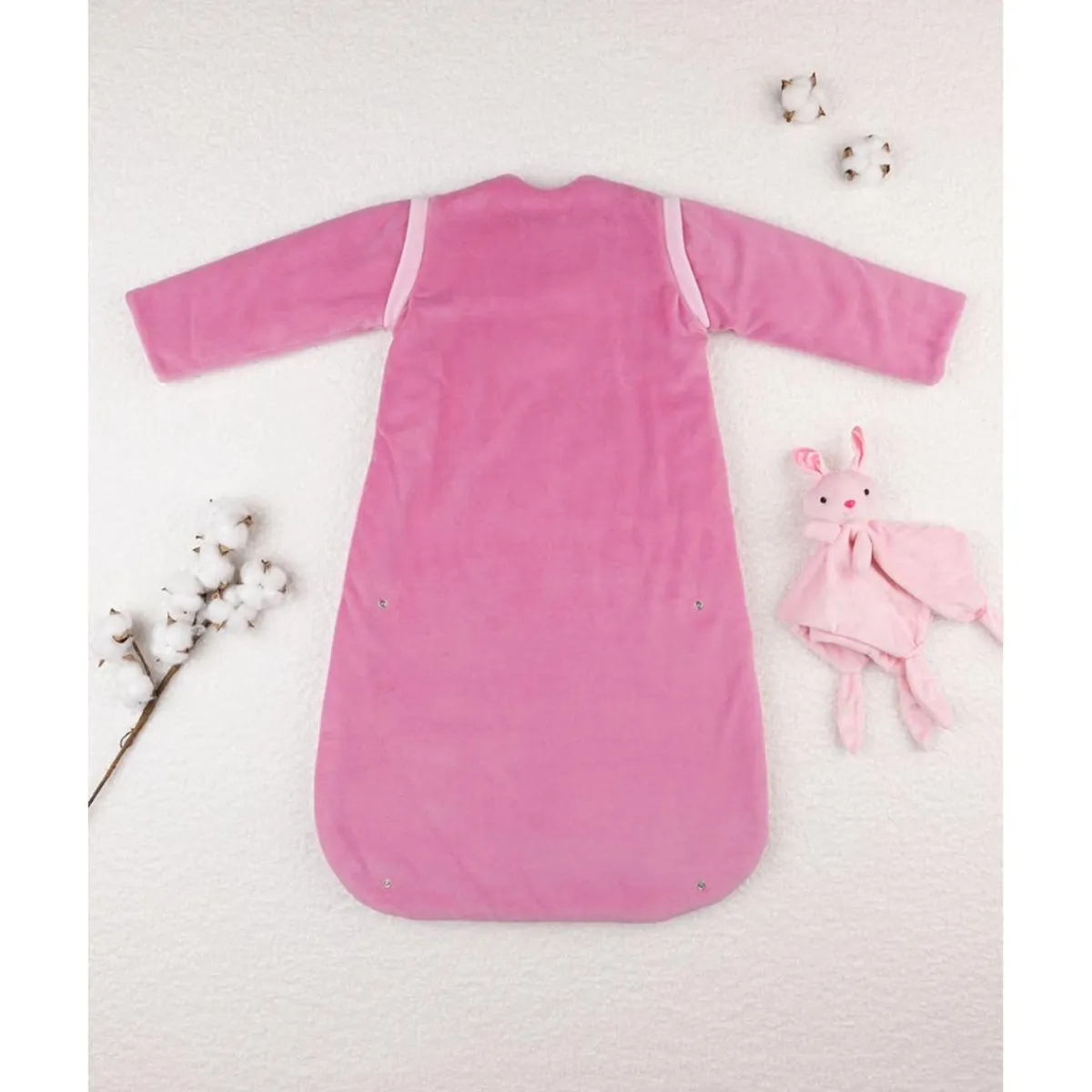 Este saco de dormir con mangas largas ha sido diseñado especialmente para aportar abrigo adicional a los bebés en climas fríos. Confeccionado en suave tejido de ciniglia con interior en algodón 100%, combina confort y protección térmica en cada uso. Su diseño presenta un fondo rosa claro con mangas en un tono rosa más intenso a contraste y un delicado motivo decorativo en el centro.