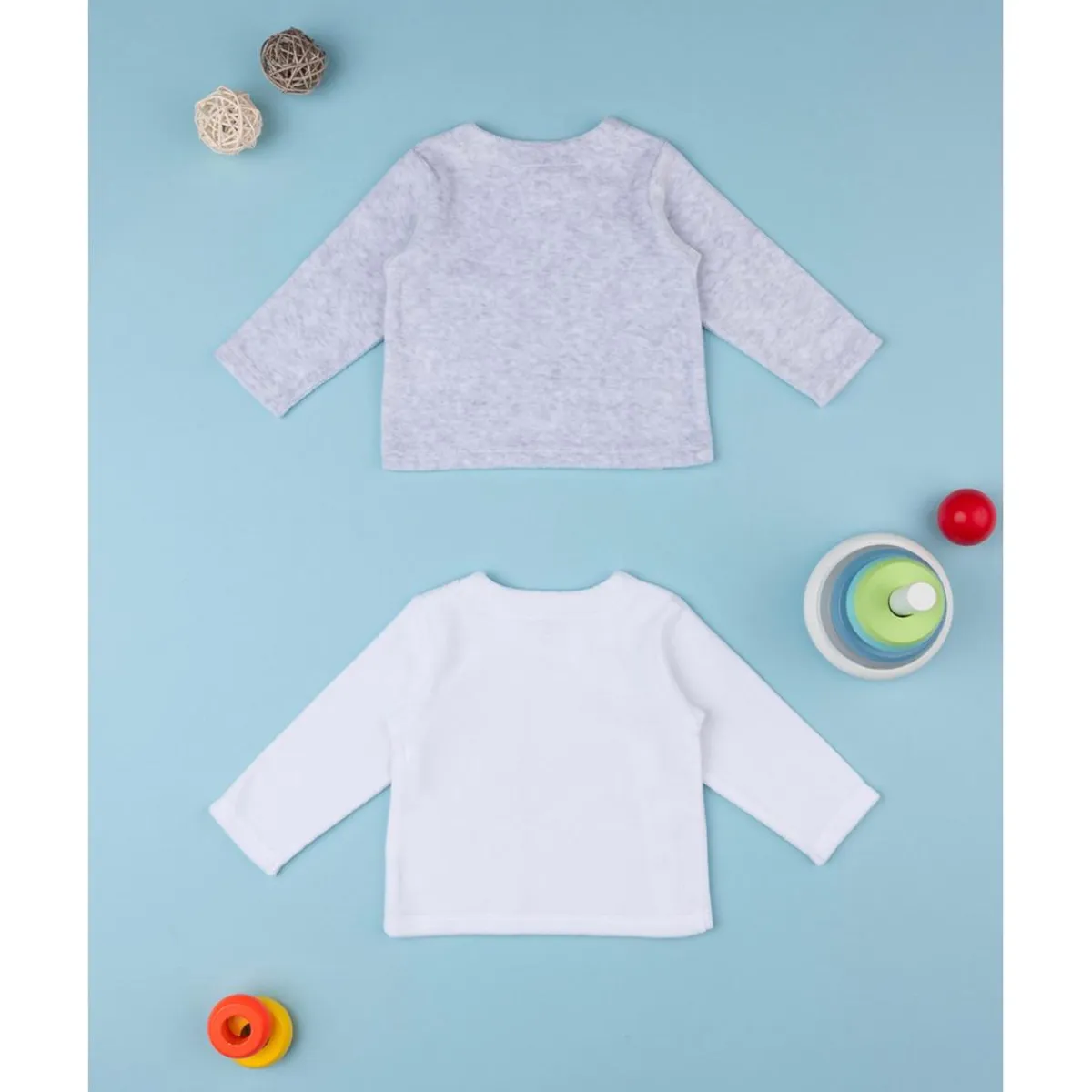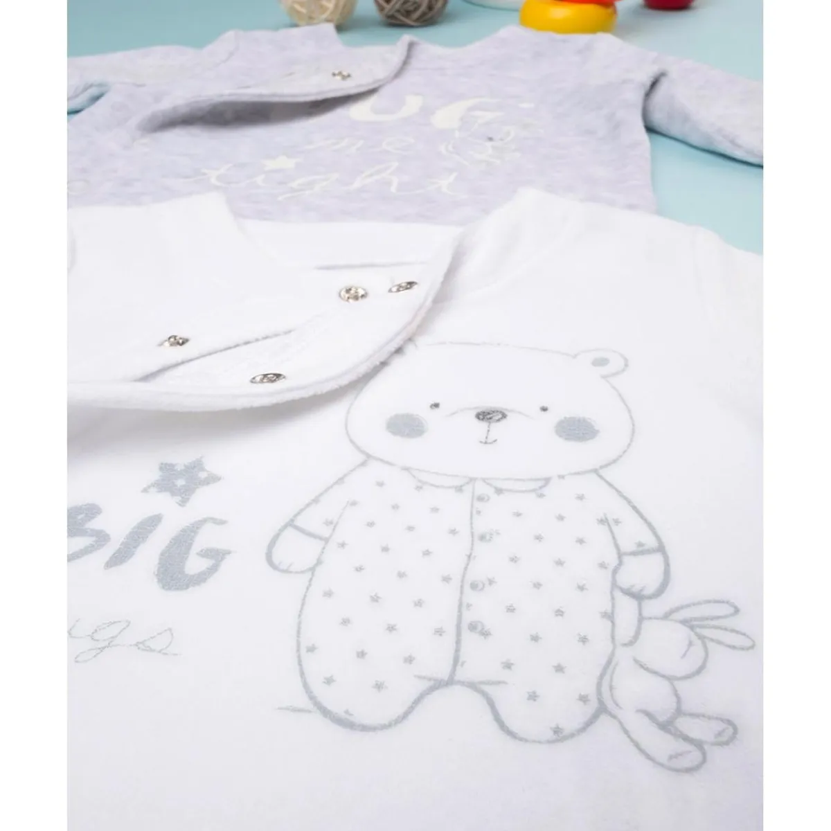 Este set incluye dos chaquetitas para recién nacido confeccionadas en cálida felpa de algodón. Una pieza es gris claro mélange con cierre de corchetes automáticos y la frase «hug me tight». La otra es blanca con cierre de corchetes y la tierna ilustración de un osito en pijama junto a la frase «big hugs».