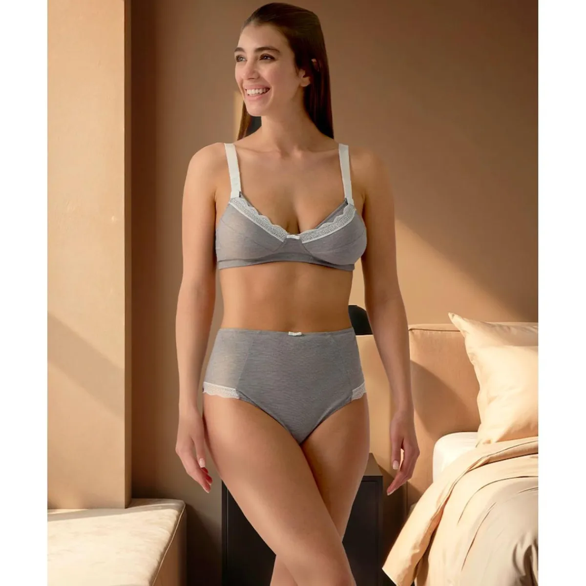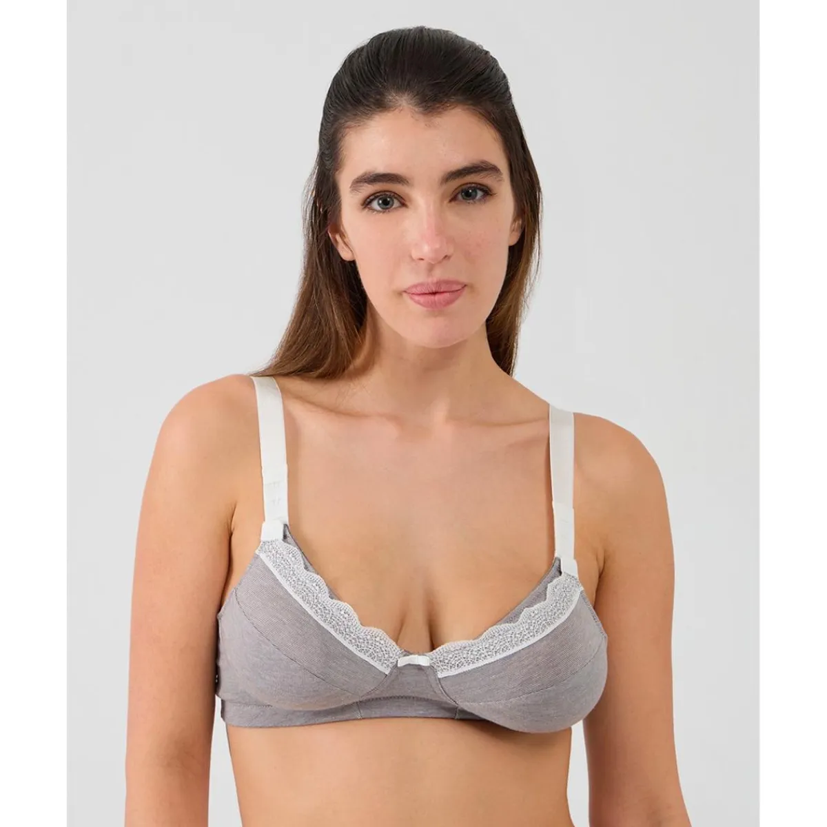 Cómodo sujetador de lactancia con una confección que crea un delicado efecto de rayas. El bordado de encaje lateral y el pequeño lazo decorativo añaden un toque romántico y refinado. Copas desmontables que facilitan el momento de la lactancia y tirantes ajustables. Combínalo con la braga a juego.