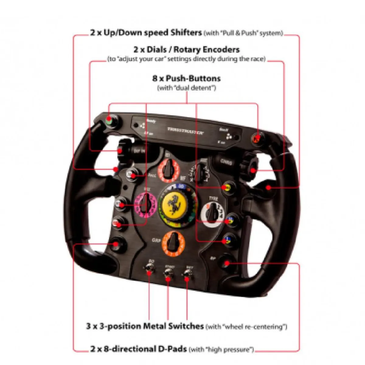 - Ruedas giratorias, interruptores y botones de acción de calidad profesional: Volante de carreras desmontable que incorpora el sistema Thrustmaster Quick Release.