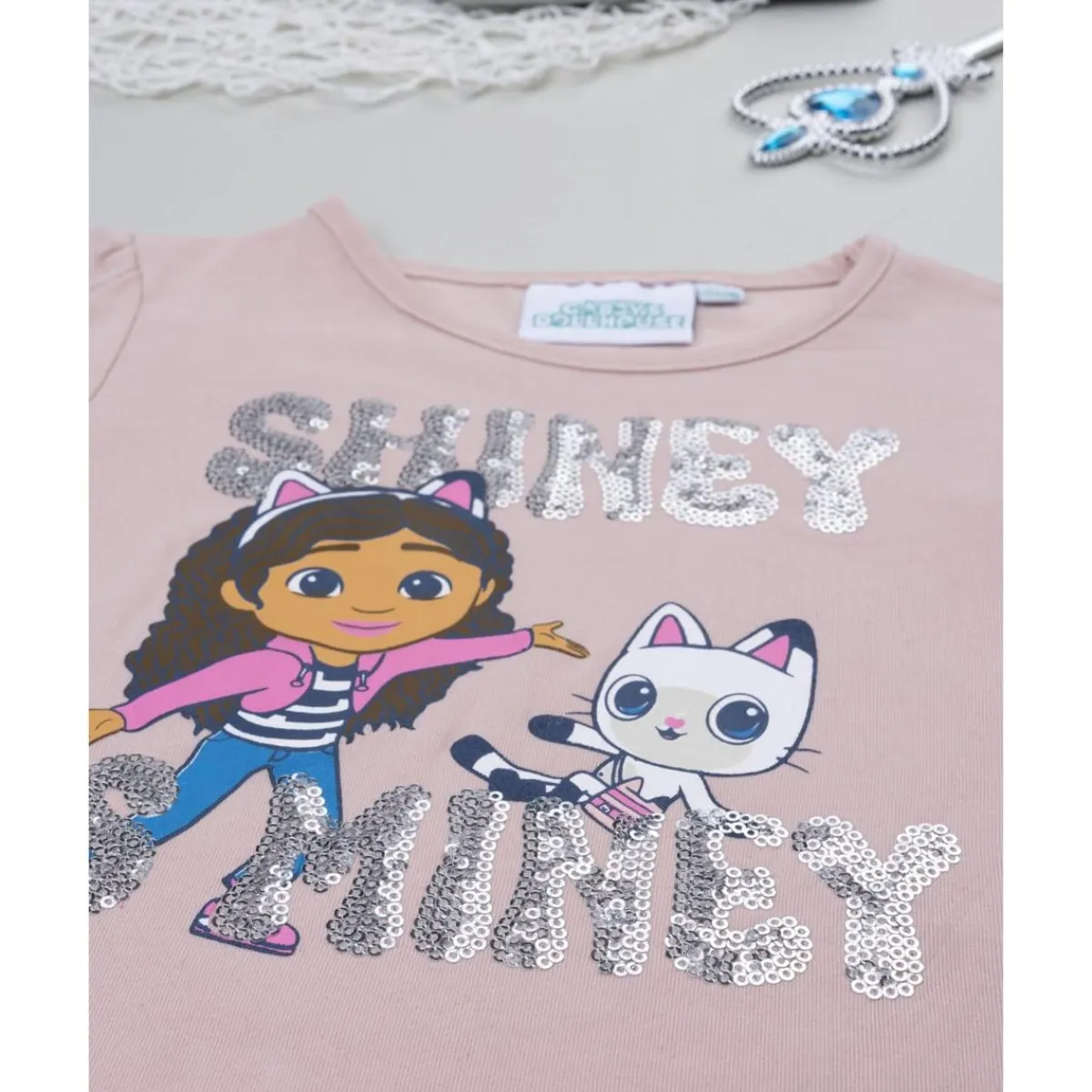 Esta camiseta de niña de manga larga está confeccionada en algodón con un toque de elastano para mayor comodidad. Presenta base rosa con estampado de Gabby en la parte frontal. Su ajuste es suave y regular, ideal para looks casuales y fáciles de combinar.