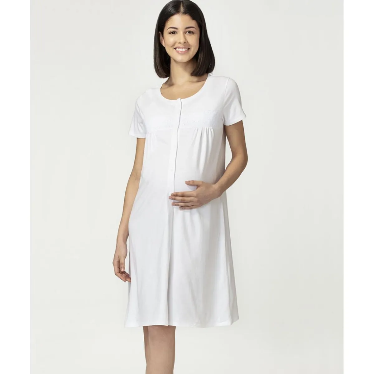 Cómoda camisa de noche de algodón gris jaspeado de mangas cortas con amplio cuello y botones al tono en el centro.