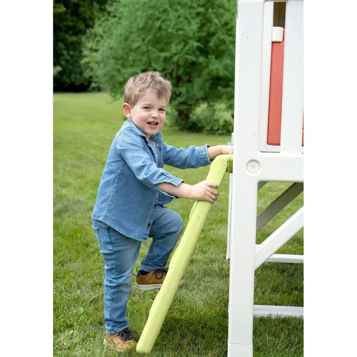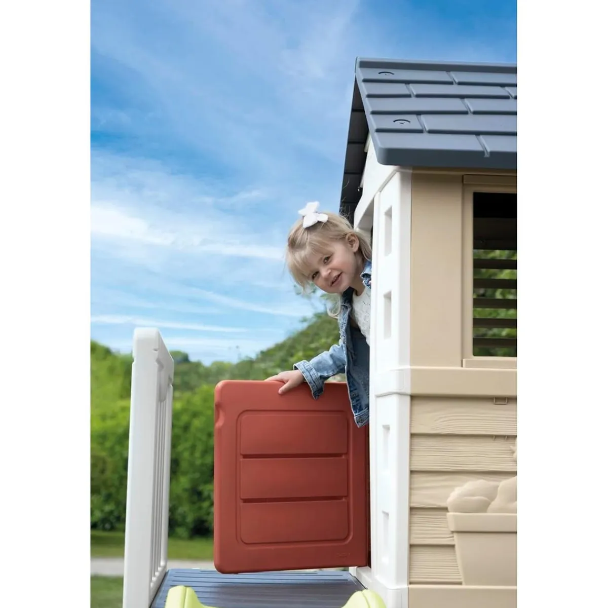 La «Casita de la playa con tobogán» es una invitación a la aventura y al juego imaginativo en el jardín de casa. Con su diseño elevado, permite a los pequeños disfrutar de una vista privilegiada mientras juegan, explorando un mundo lleno de posibilidades. La estructura, que se alza 70 cm sobre el suelo, viene equipada con un porche acogedor y un tobogán que asegura horas de diversión continua.