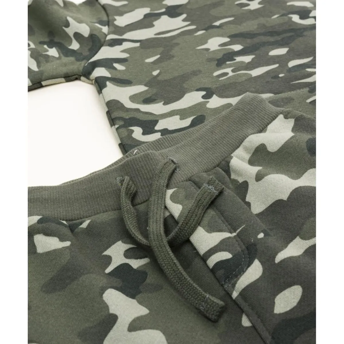 Moderno conjunto de dos piezas para niño con estampado camouflage. Incluye sudadera con capucha y bolsillo delantero, junto a pantalones cargo a juego con cintura elástica para un ajuste perfecto.