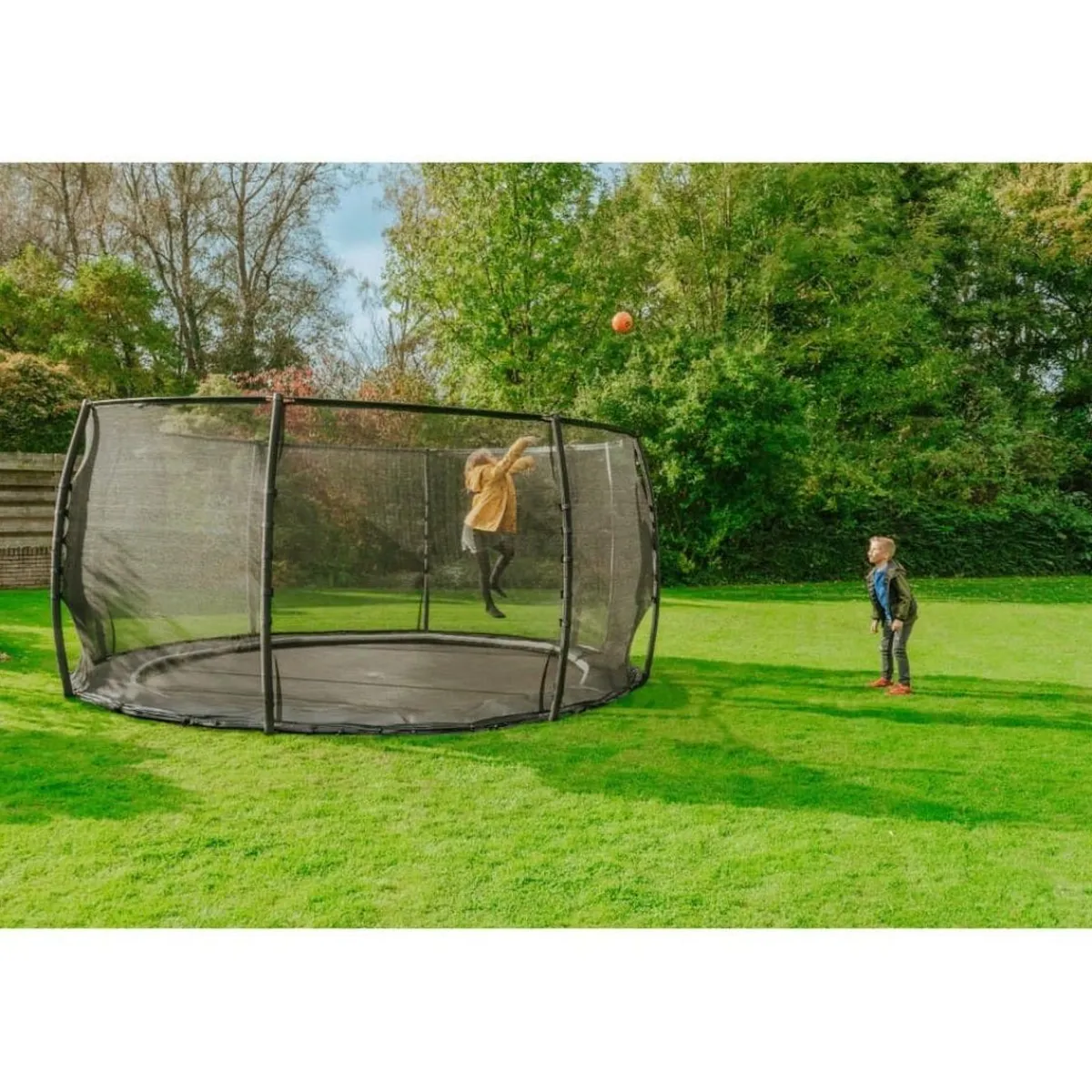 Exit – Cama elástica de suelo Dynamic 427 cm negro con red de seguridad, un trampolín redondo a nivel del suelo de color negro mate con calidad superior.