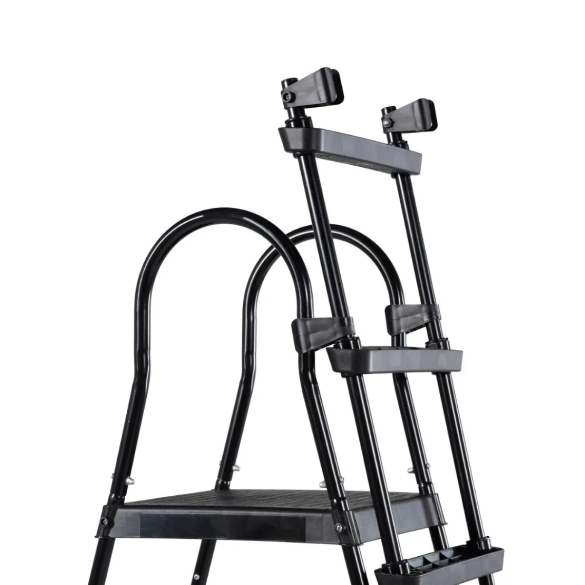La escalera negra tiene una barandilla a la que los niños pueden agarrarse y los escalones tienen una capa antideslizante para que los niños no se resbalen cuando estén mojados. La escalera tiene una plataforma en el medio para facilitar que los niños salten sobre el borde de la piscina. La escalera también se puede plegar fácilmente desde el exterior de la piscina, una característica útil para que los más pequeños no puedan simplemente subir a la piscina.