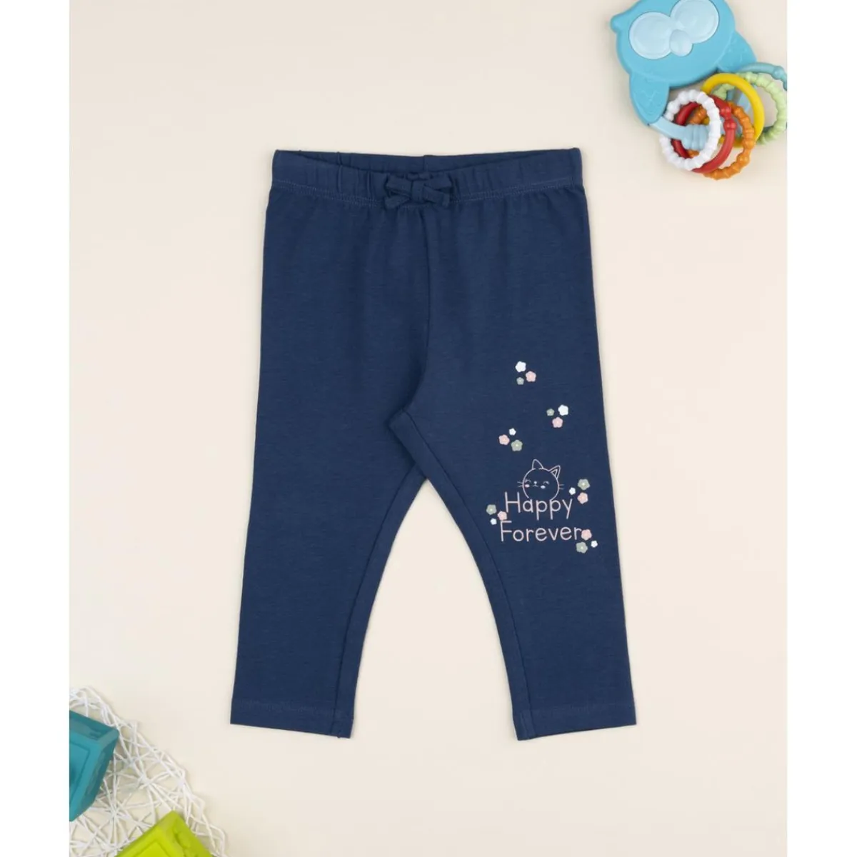 Leggings elástico de estilo casual para niña, en azul noche con estampado floral bordado a tono. Suave y cómodo, con cintura elástica. Perfecto para looks relajados y combinaciones versátiles.