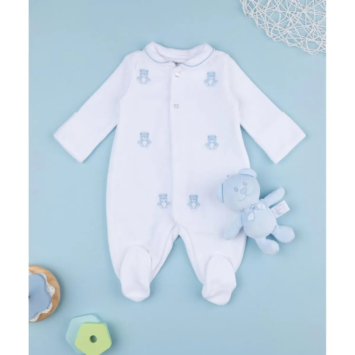 Suave pelele de terciopelo para bebé. La prenda se presenta en una sola pieza con pie y se desarrolla en un total blanco con cuello. Ositos azules pequeños bordados por todas partes. El ajuste es holgado y práctico gracias a los botones automáticos en la parte delantera y en la entrepierna. Osito de regalo en el paquete