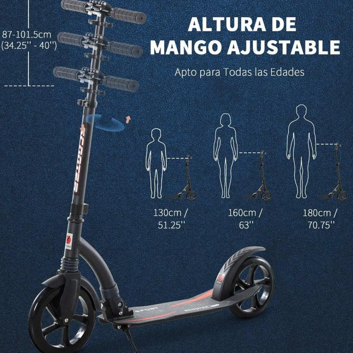 Si tienes 14 años o más y buscas un patinete, este de HOMCOM te gustará. Cuenta con una base amplia antideslizante para poder poner cómodamente los pies, ruedas grandes de PU con amortiguación de impactos, manillar regulable en altura y con empuñaduras acolchadas, freno posterior y caballete para poderlo parar manteniéndolo de pie ¡no lo pienses más, es el patinete que estabas buscando!