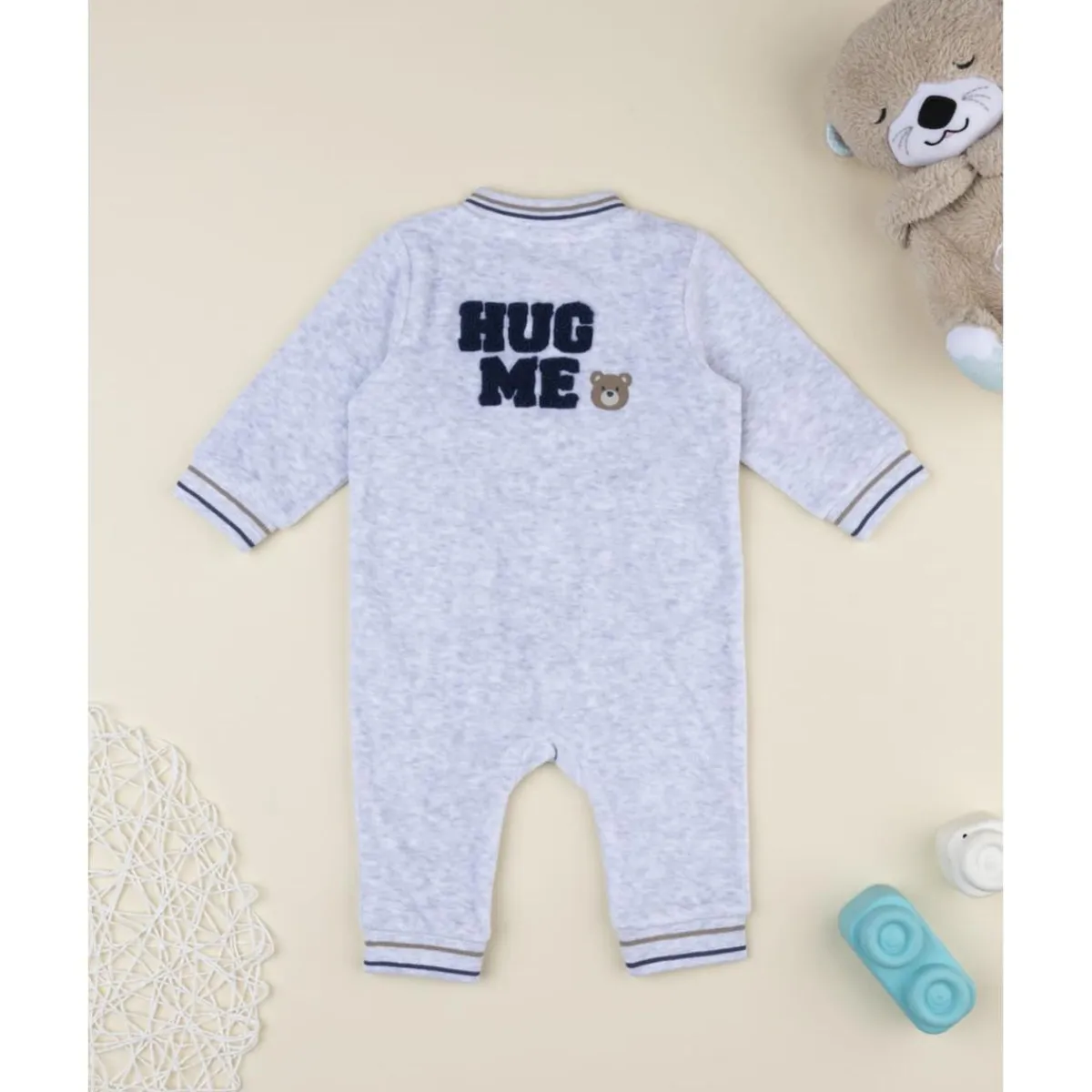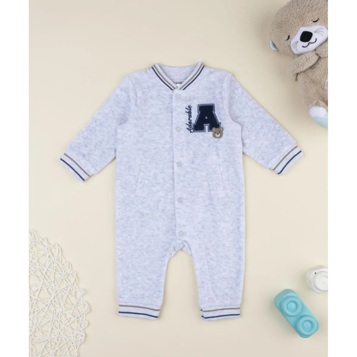 El pijama entero para recién nacido, en suave terciopelo gris claro, incorpora detalles a rayas marrones y azul en contraste y un parche temático muy tierno. El escote en V y el cierre frontal con automáticos agilizan el cambio, mientras la prenda envuelve con calidez sin limitar el movimiento.