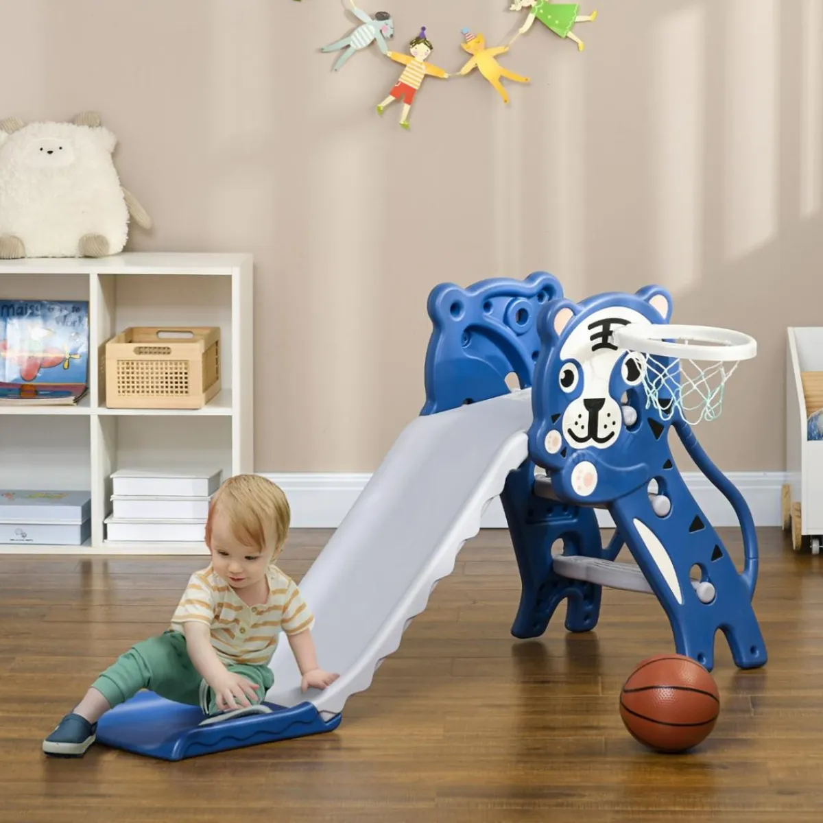 Homcom – Tobogán de interior Tigre. Diseñado para proporcionar horas de diversión, este tobogán para niños cuenta con 2 escaleras antideslizantes para garantizar a los más pequeños un apoyo seguro y una estructura confiable. El tobogán también cuenta con una canasta de baloncesto montada lateralmente para que los niños se diviertan de varias maneras con la misma estructura. Gracias a los adorables dibujos del tigre, este tobogán infantil de interior añadirá un toque juguetón a los espacios de juego de los más pequeños.