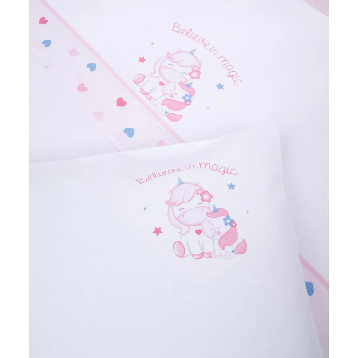 Este tierno juego de cama consta de tres piezas perfectas para la cuna de tu pequeño. El sábana bajera es de un suave color rosa, mientras que la sábana superior es blanca y cuenta con una adorable estampación de un unicornio saltando frente a un colorido arcoíris. La funda de almohada, también blanca, presenta el mismo diseño encantador que la sábana superior. Un conjunto encantador para dar un toque mágico al dormitorio de tu bebé.