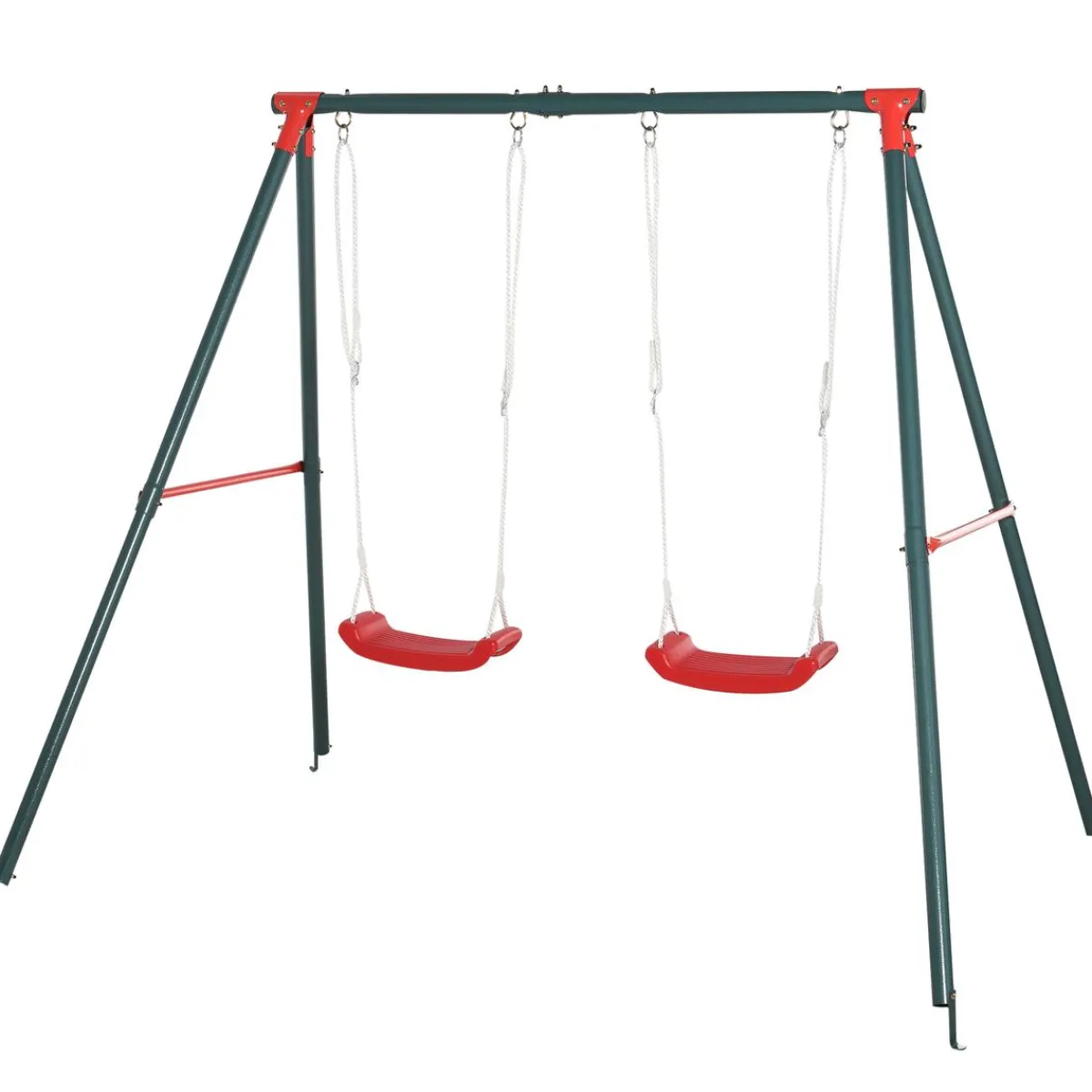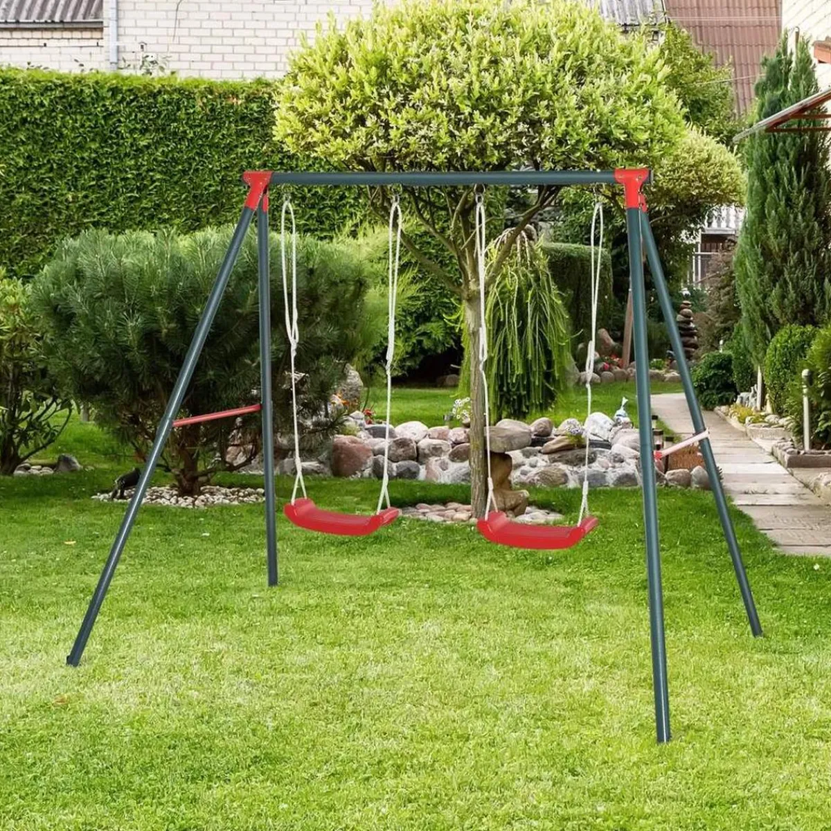 Outsunny – Columpio metálico doble. No hay nada mejor que disfrutar al aire libre con tus hijos. Fomenta su desarrollo mientras se divierten con este columpio infantil doble de Outsunny. Con una estructura resistente de metal lacado con pintura con revestimiento en polvo y con una parte que se entierra en el suelo para garantizar mayor estabilidad y resistencia con el movimiento de balanceo de los dos columpios. Para que los niños se diviertan jugando en el jardín, terraza, o cualquier espacio exterior.