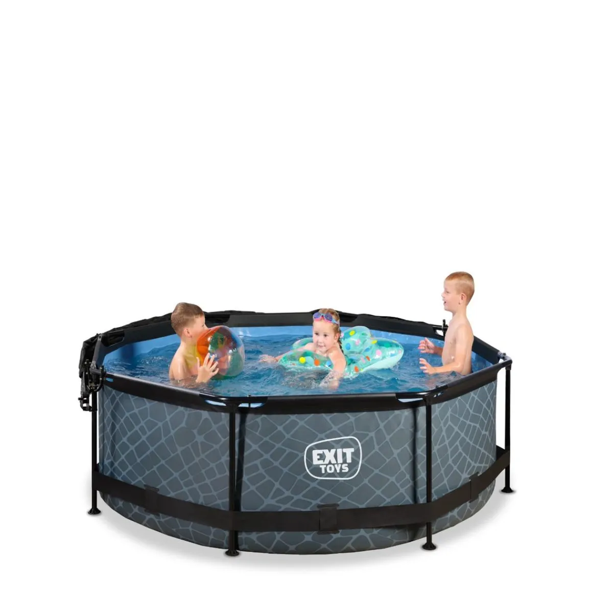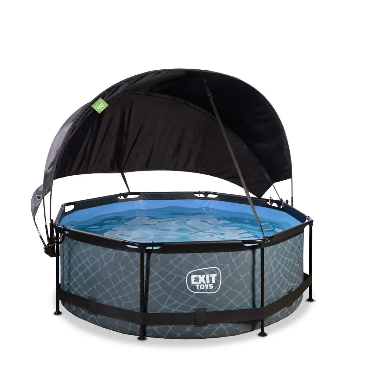 Exit – Piscina Stone efecto piedra gris diámetro 244 x 76 cm con filtro y toldo negro, una piscina redonda con aspecto de piedra que quedará perfecta en tu jardín.