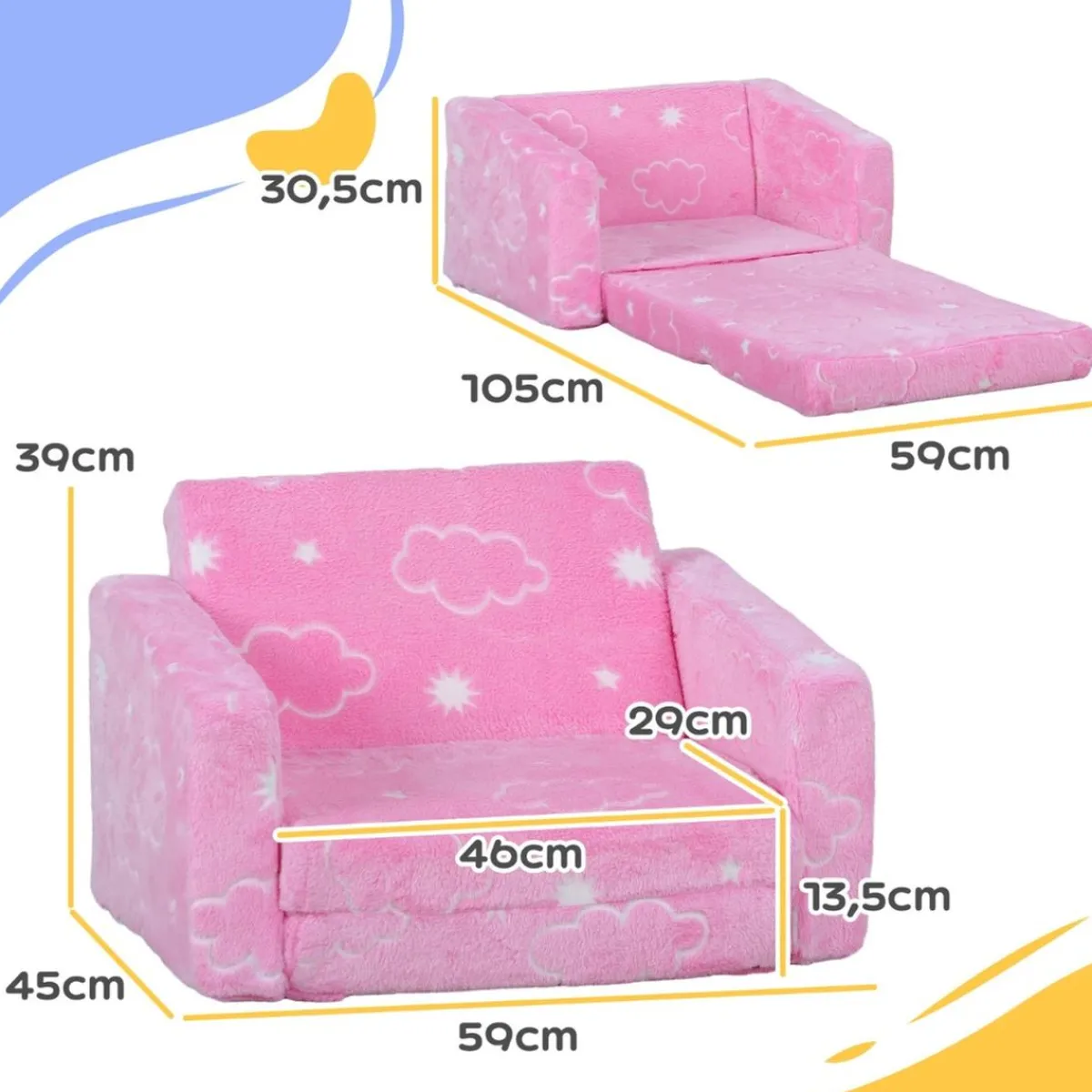 Homcom – Sillón infantil Rosa brilla en la oscuridad. Este increíble sofá infantil, con tela luminosa, encantará a los niños al transformar su habitación en un espacio mágico por la noche. Su diseño 2 en 1 permite ajustarlo fácilmente de una posición de sentado a una de descanso, ideal para siestas o momentos de relax. Hecho de espuma suave, con un respaldo amplio y reposabrazos, este sillón proporciona un excelente confort para los pequeños.
