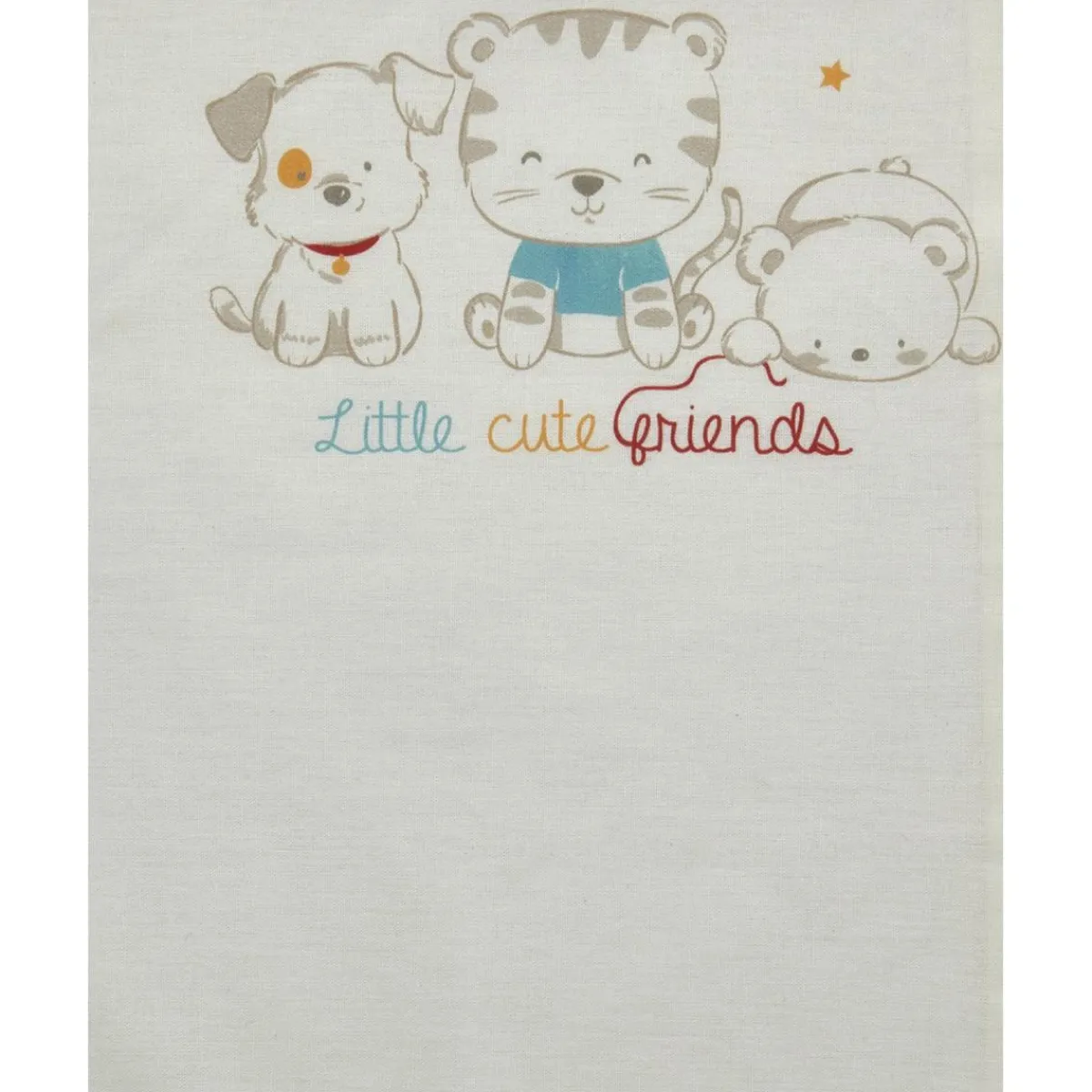 Este práctico juego para cuna o cochecito de algodón consta de una sábana encimera con la impresión de tres simpáticos animalitos en el frente y un borde con estampado de rayas finas; una funda de almohada con bordes estampados a juego y una sábana bajera sin esquinas.