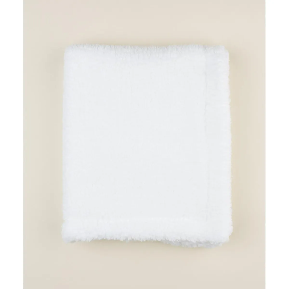 Manta de chenilla suave y manejable para recién nacidos, en total blanco con detalles de peluche. Su tejido certificado Oeko-Tex garantiza seguridad y ausencia de sustancias nocivas, ideal para proteger y abrigar al bebé con delicadeza.