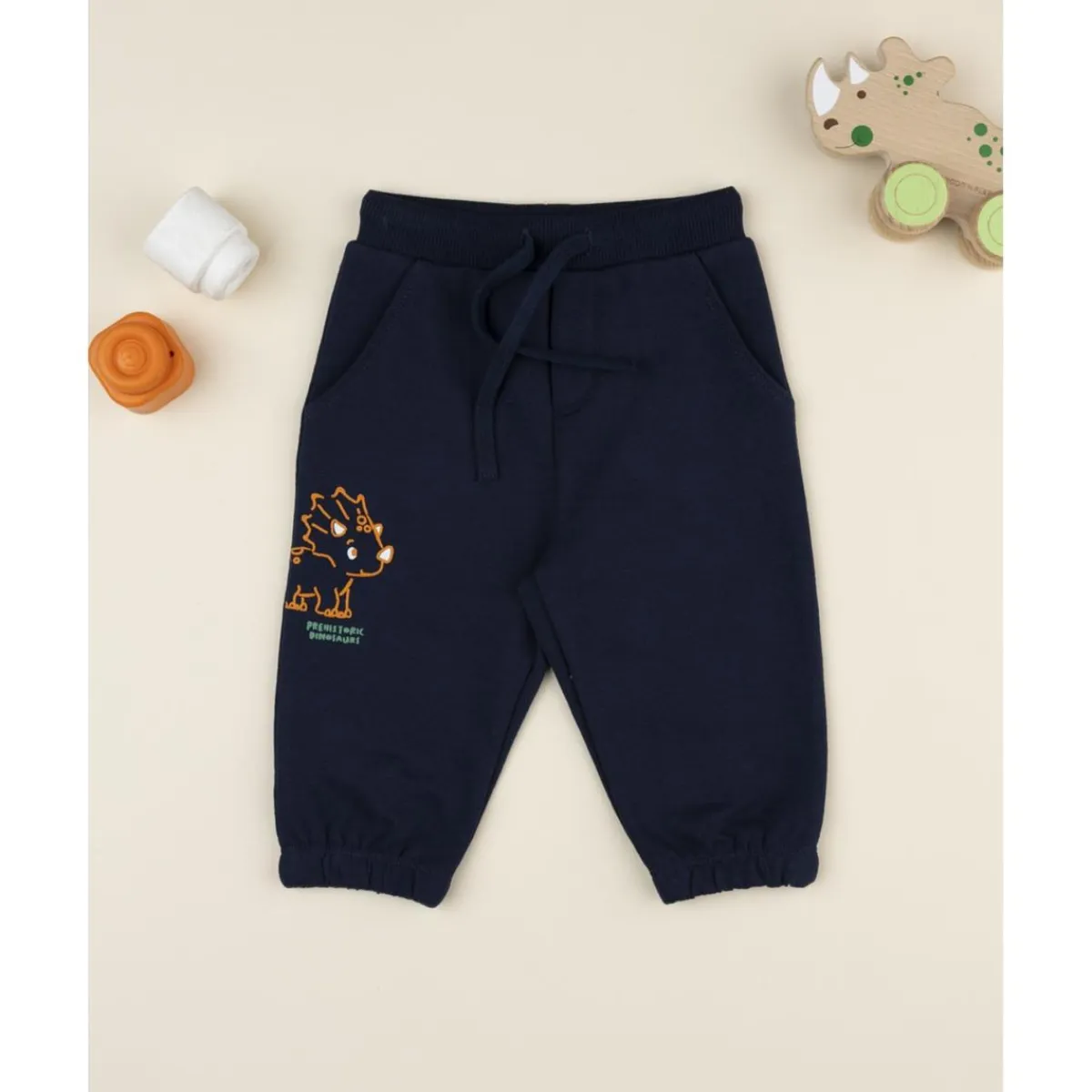 Estos pantalones para niño de color azul noche están confeccionados en un suave terciopelo francés y cuentan con un pequeño estampado en relieve que representa un triceratops. La cintura elástica ajustable asegura un ajuste cómodo y práctico para el niño, permitiéndole moverse libremente mientras mantiene el estilo.
