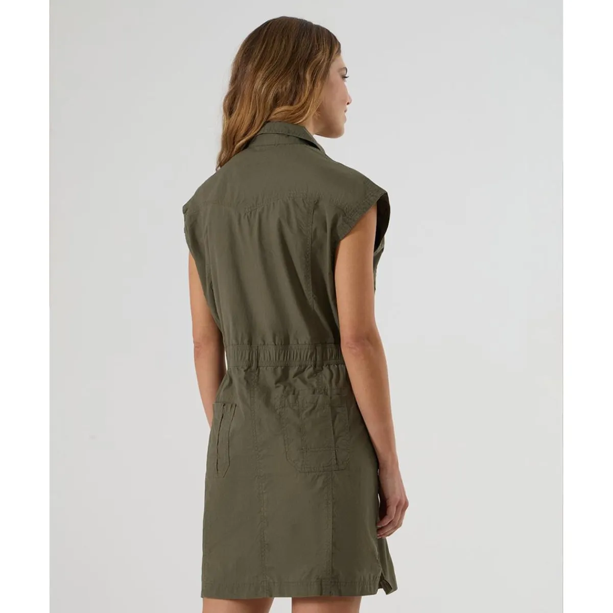 Este vestido camisero en verde militar es una opción ideal para mamás durante y después del embarazo. Gracias a su cierre delantero con botones metálicos, facilita la lactancia de manera práctica. Con cuello camisero, sin mangas y corte fluido, incorpora elástico en la cintura y múltiples bolsillos delanteros y traseros. Un look cómodo y con estilo para cualquier momento del día.