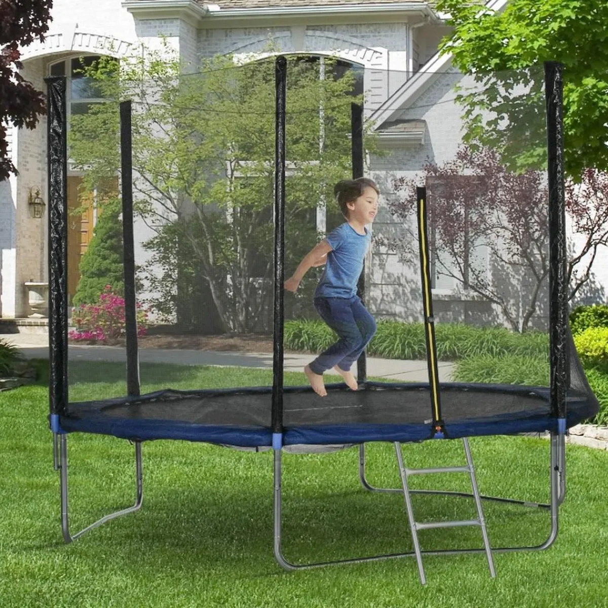 - Acceso fácil. Esta cama elástica de exterior tiene una puerta con cierre de cremallera para facilitar la entrada y la salida. Además, cuenta con una escalera de acero galvanizado para mayor comodidad.