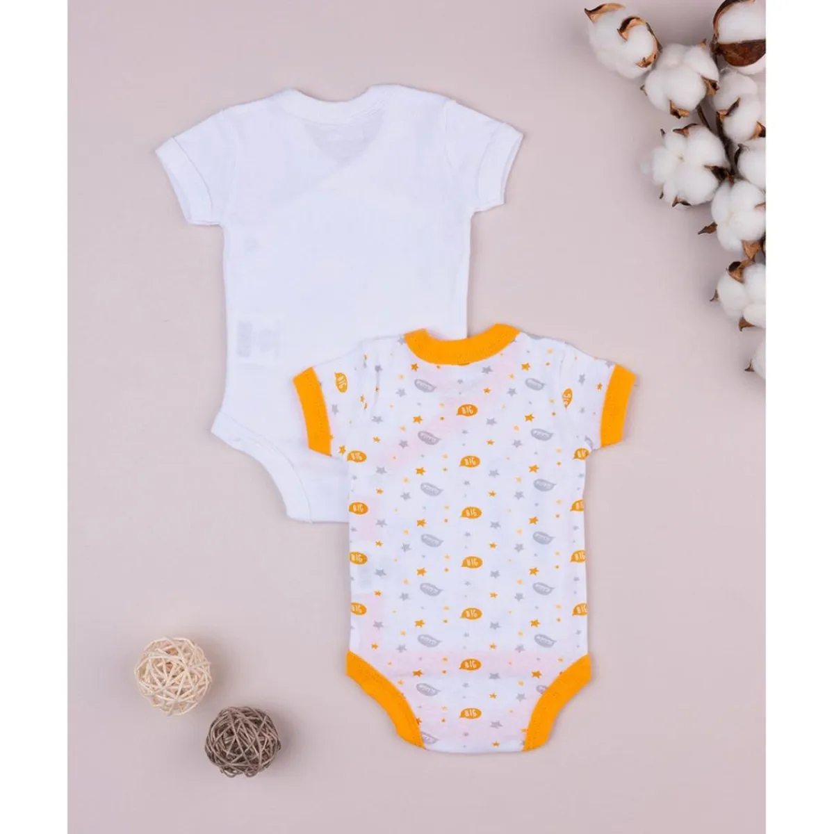 Un body es blanco con estampado de pequeños animales, el otro con estampado all-over de estrellitas y escritos. Accesorios no a la venta. El paquete contiene solo las prendas de vestir.