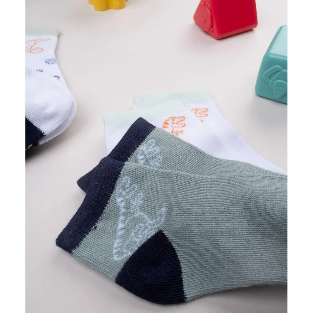 El Pack básico de 5 calcetines Dinosaurios para niño ofrece comodidad y estilo para los más pequeños. Incluye una variedad de colores, incluyendo blanco, gris y negro, con estampados coordinados.